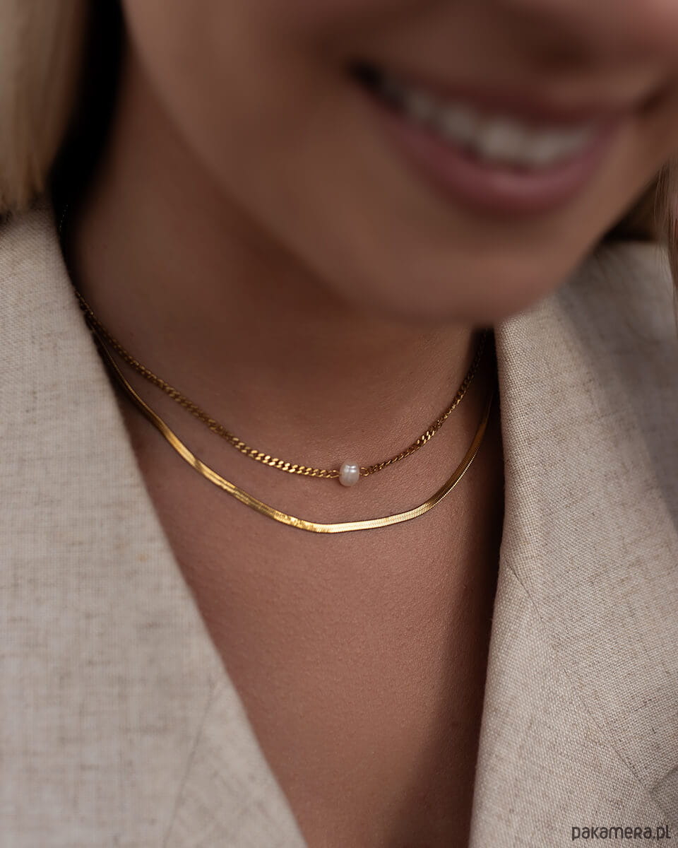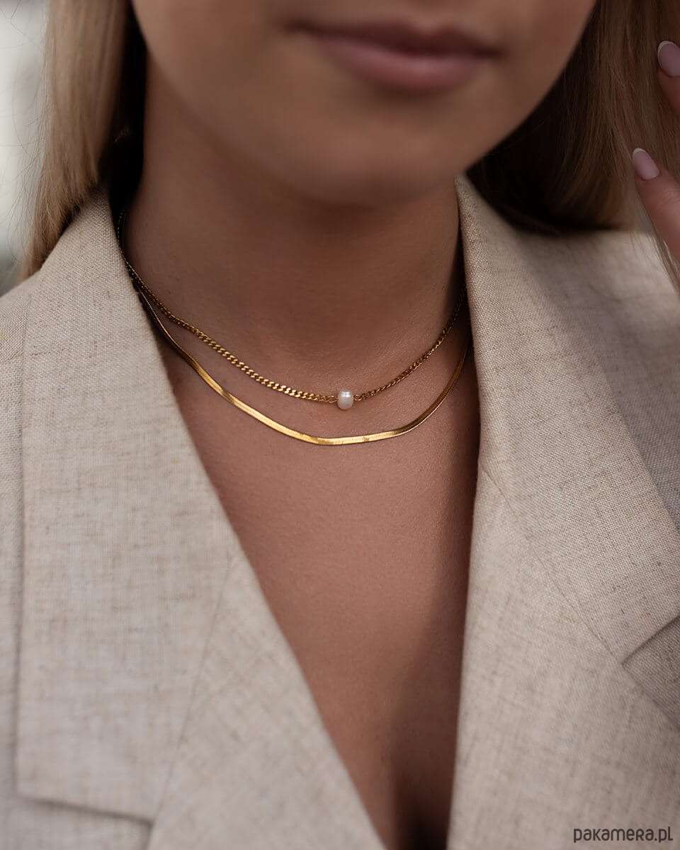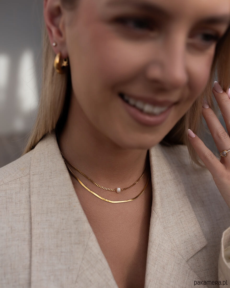 Stylowy, złoty naszyjnik o podwójnym splocie to uniwersalna biżuteria, która idealnie wpisuje się w aktualne trendy. Subtelne połączenie dwóch różnych łańcuszków - klasycznego splotu typu ankier oraz eleganckiej żmijki tworzy efektowną całość, która przyciąga wzrok i dodaje szyku każdej stylizacji. Wykonany ze stali chirurgicznej premium, naszyjnik zachowuje blask nawet przy intensywnym użytkowaniu. Jest wodoodporny, nie ciemnieje, nie ściera się i nie traci koloru, dzięki czemu zyskujesz trwałą i estetyczną biżuterię na lata. Idealny dla kobiet, które zastanawiają się jaka biżuteria nie uczula i jednocześnie świetnie wygląda w każdej stylizacji - od codziennej po wieczorową.Ten model świetnie sprawdzi się także jako prezent, minimalistyczny, ale niebanalny, pasujący do wielu gustów.Wymiary:Długość: 40 cm + 5 cm