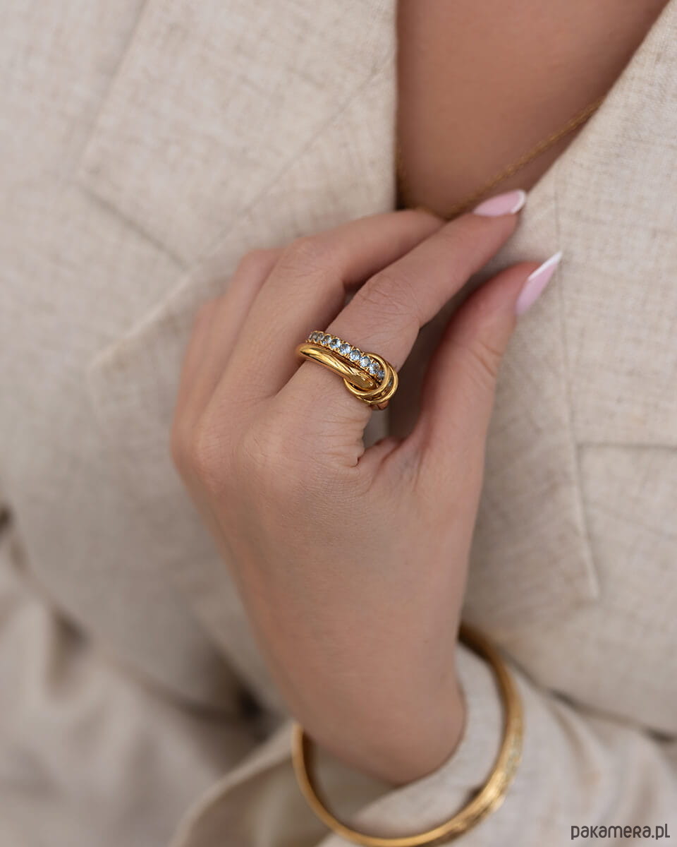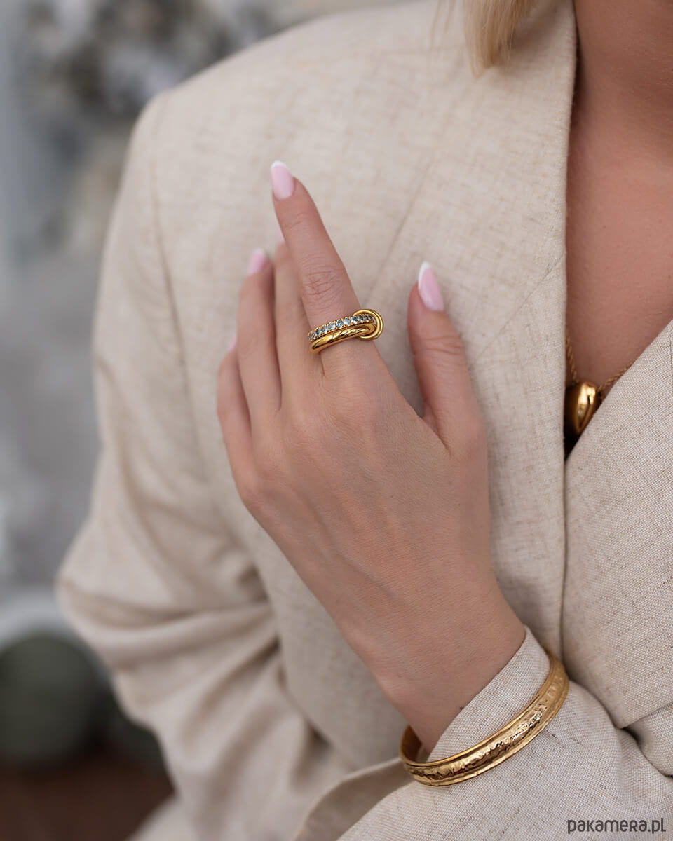 Złoty podwójny pierścionek z cyrkoniami ze stali szlachetnej premium Paraiso