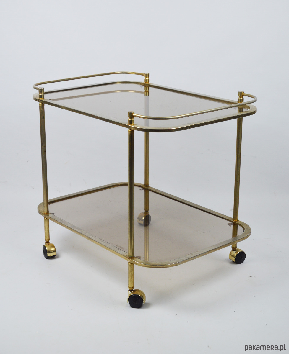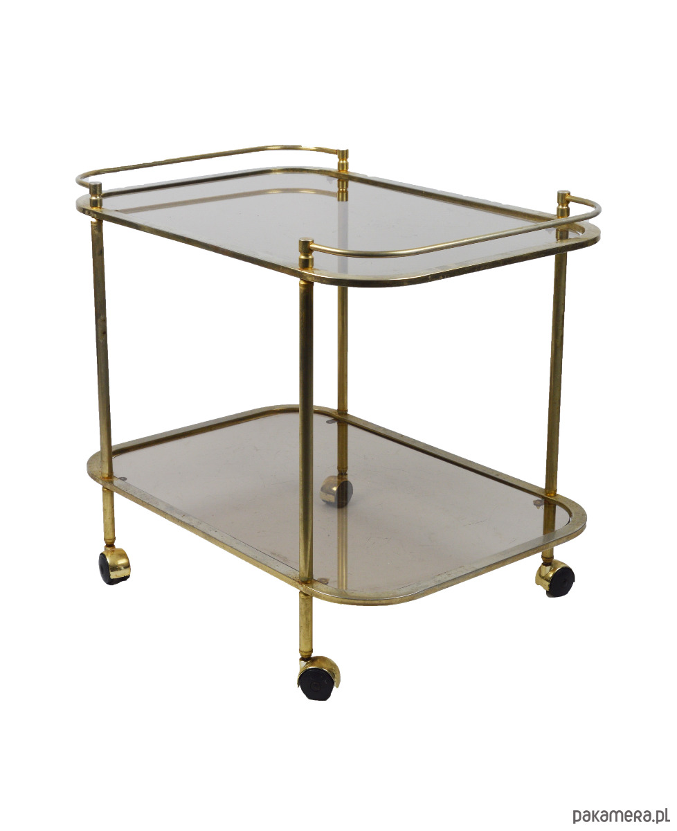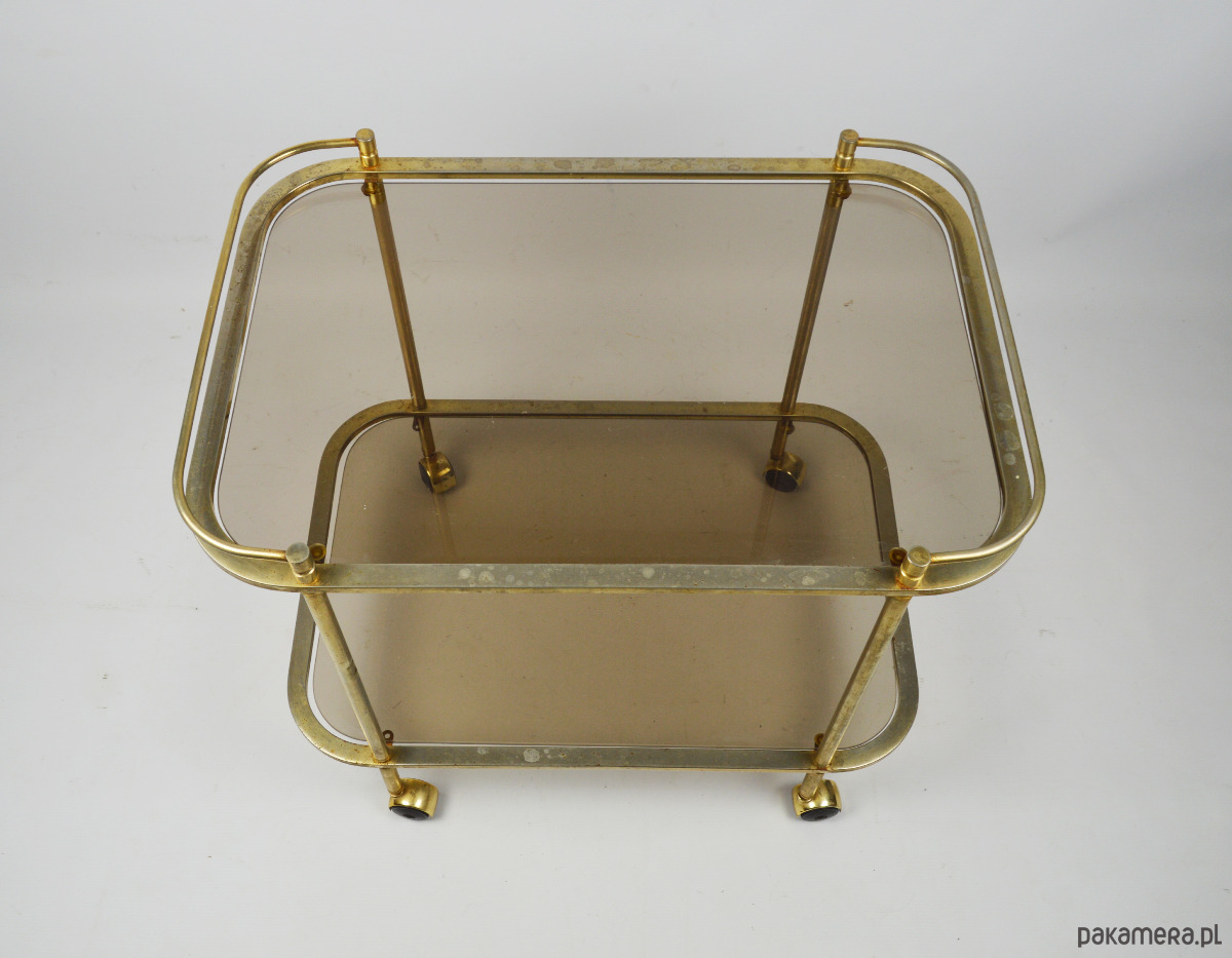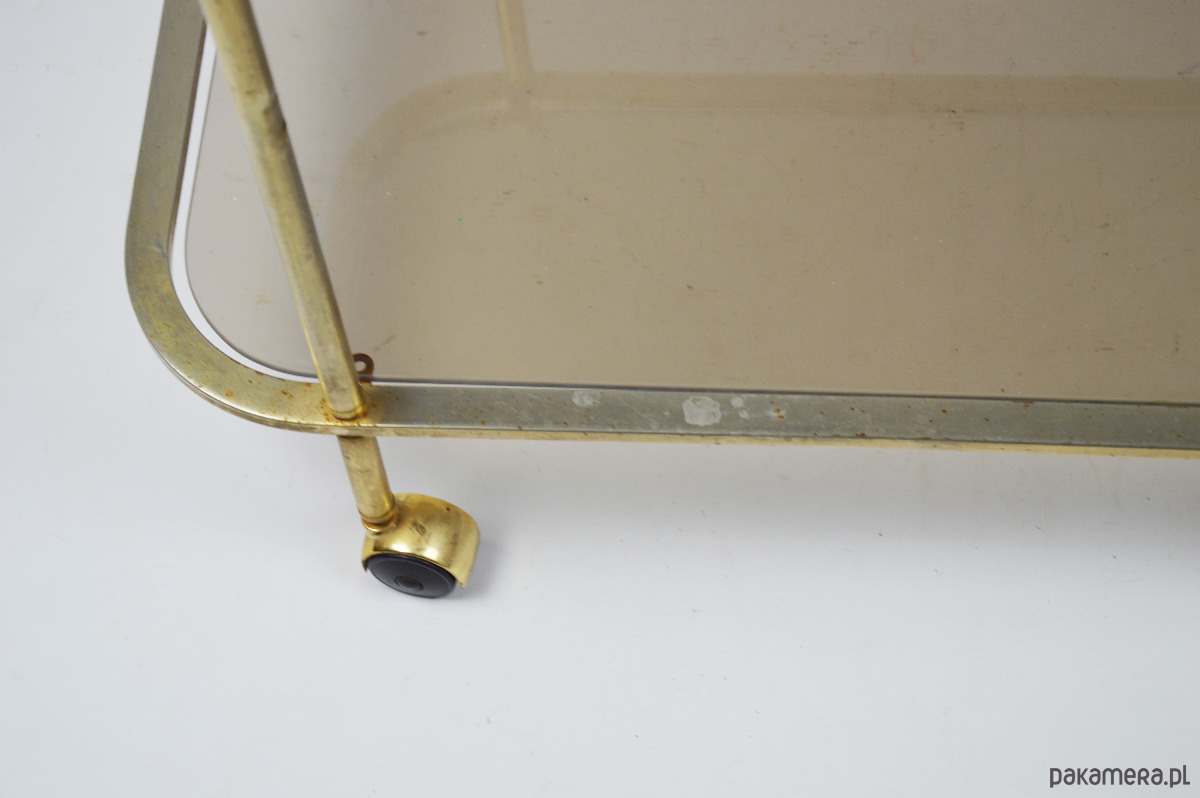 Złoty stolik barowy na kółkach z lat 80. Stan zachowania dobry, widoczne utlenienia i rysy.
