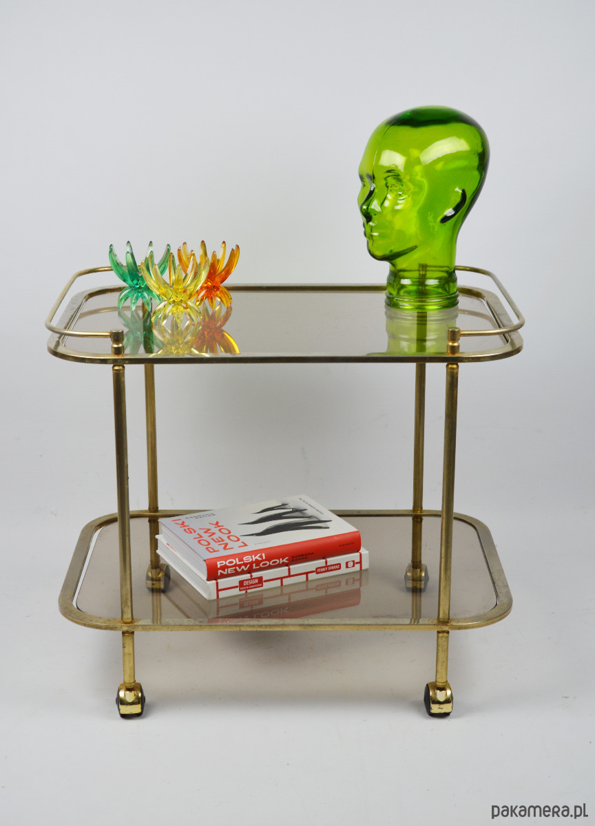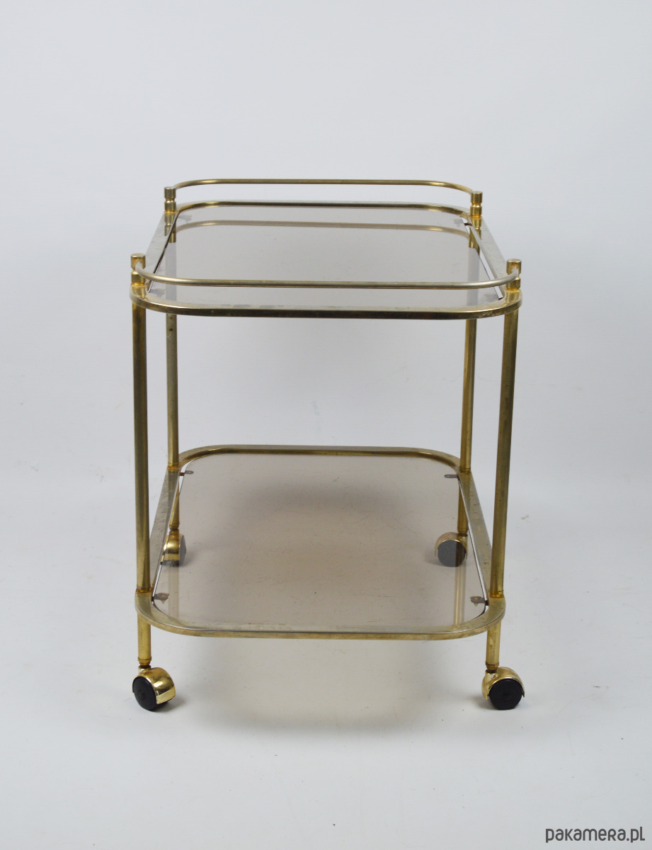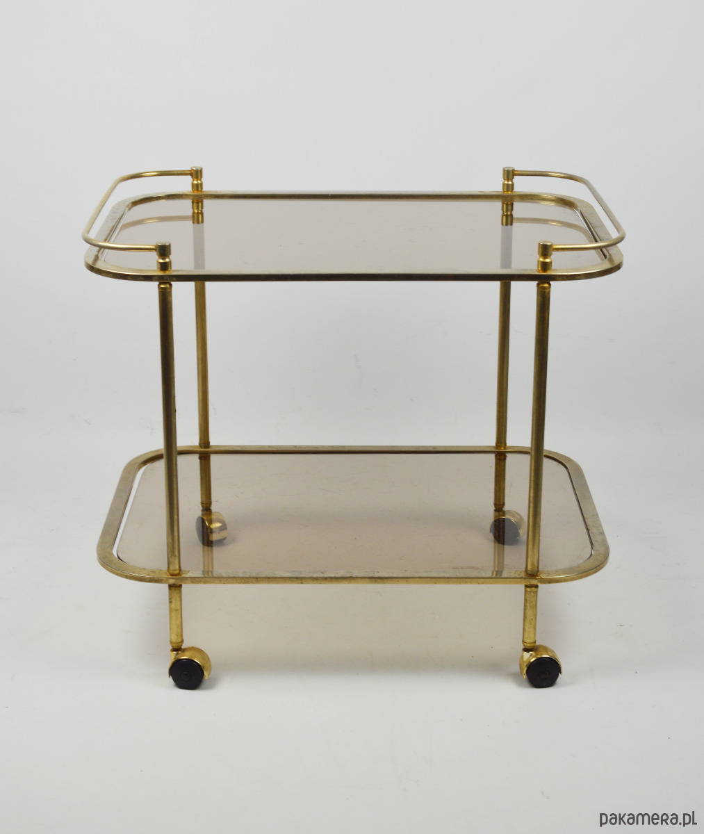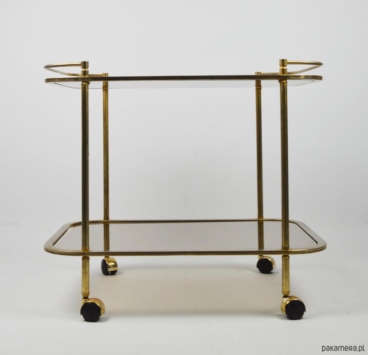 Złoty stolik barowy na kółkach z lat 80. Stan zachowania dobry, widoczne utlenienia i rysy.