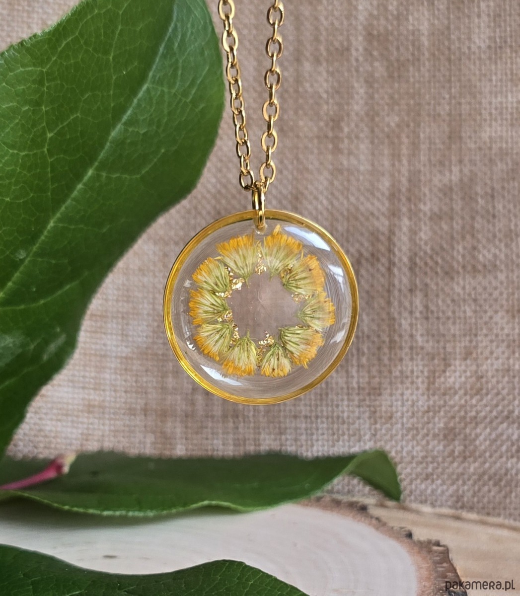 Oferuję Państwu unikalną biżuterię. Zawieszka jest wykonana z suszonych kwiatów i żywicy epoksydowej. Biżuteria jest wspaniałym i oryginalnym prezentem na lata.