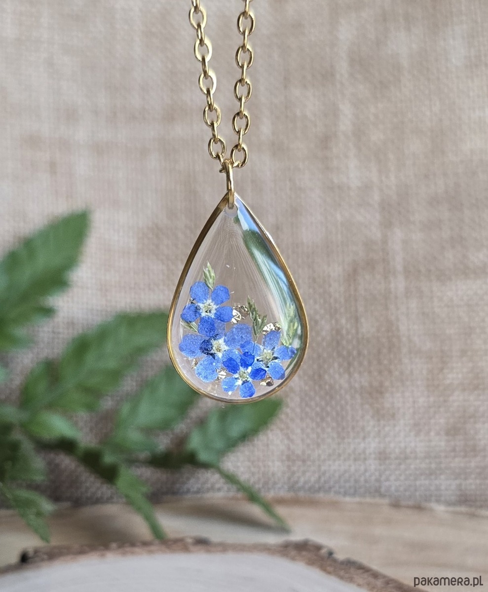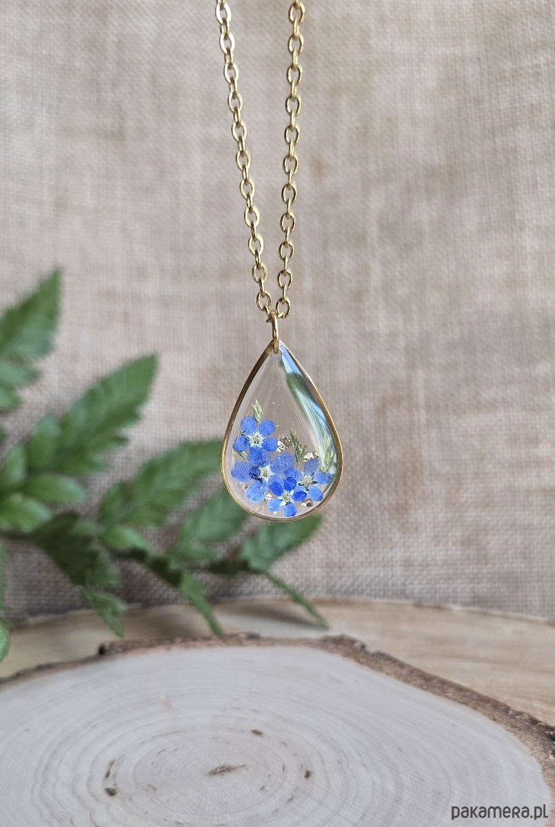Oferuję Państwu unikalną biżuterię. Zawieszka jest wykonana z suszonych kwiatów i żywicy epoksydowej. Biżuteria jest wspaniałym i oryginalnym prezentem na lata.