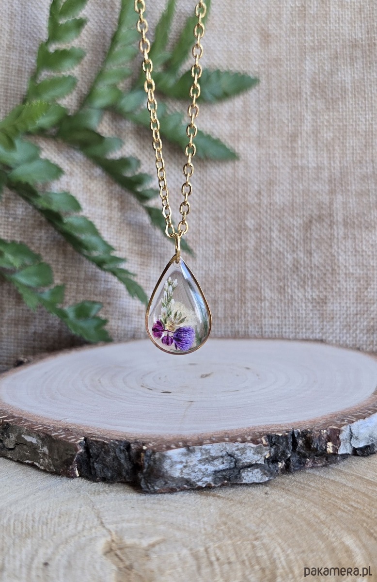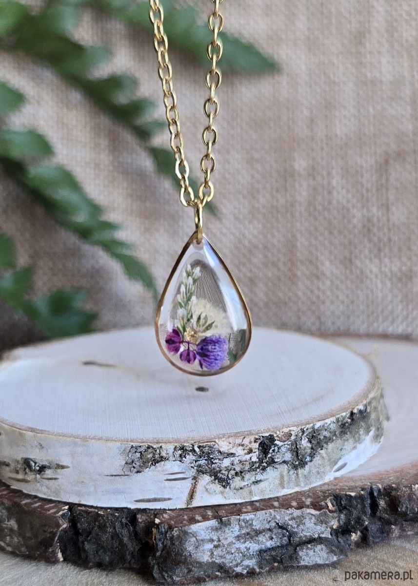 Oferuję Państwu unikalną biżuterię. Zawieszka jest wykonana z suszonych kwiatów i żywicy epoksydowej. Biżuteria jest wspaniałym i oryginalnym prezentem na lata.