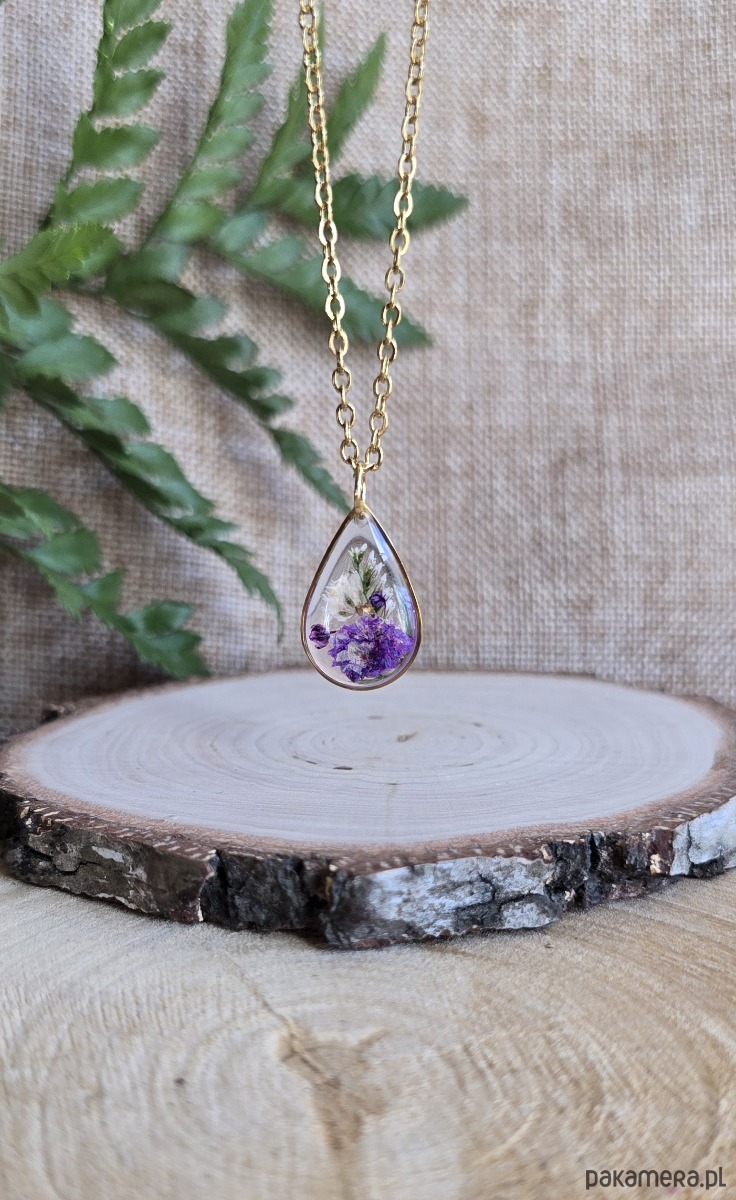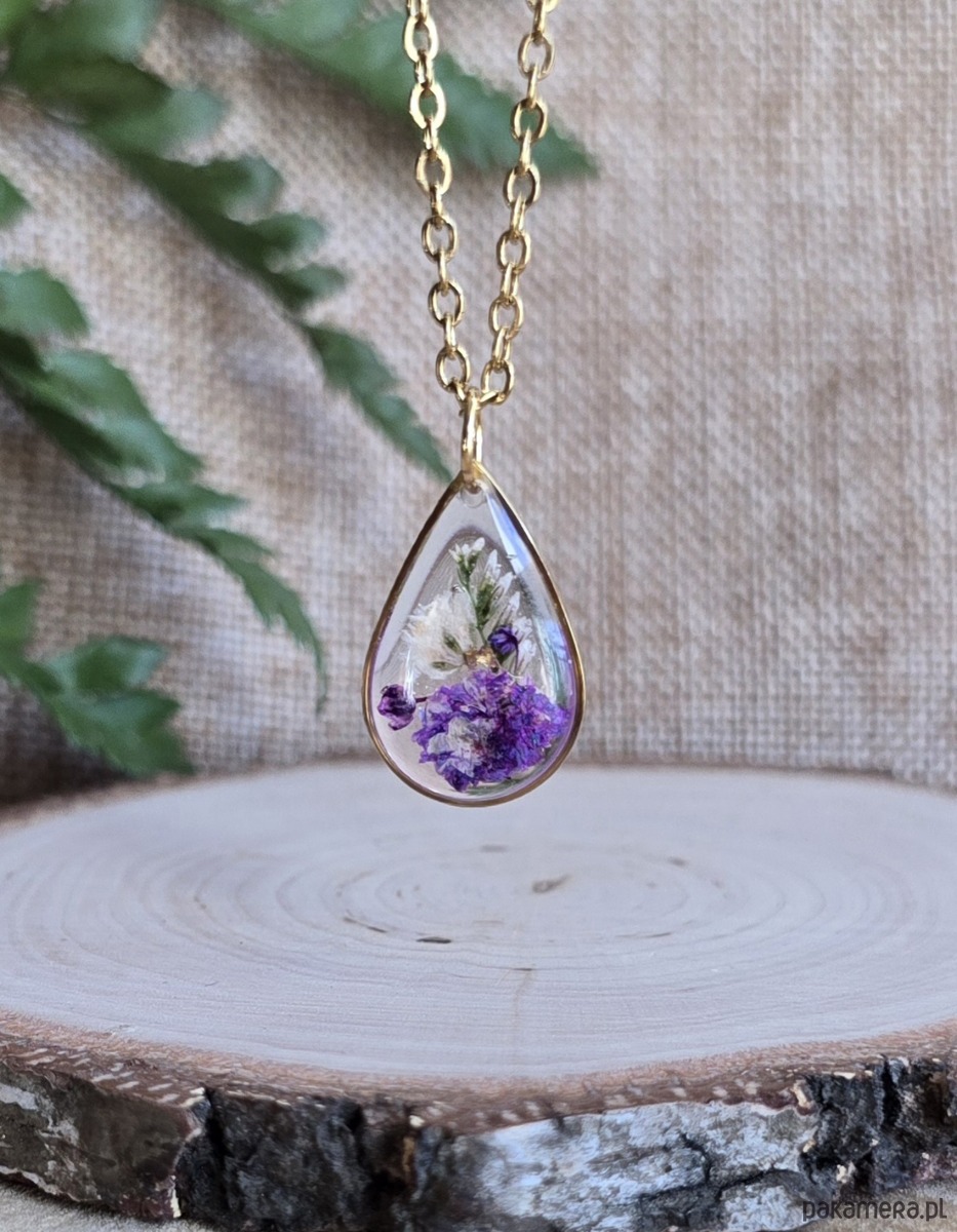 Oferuję Państwu unikalną biżuterię. Zawieszka jest wykonana z suszonych kwiatów i żywicy epoksydowej. Biżuteria jest wspaniałym i oryginalnym prezentem na lata.