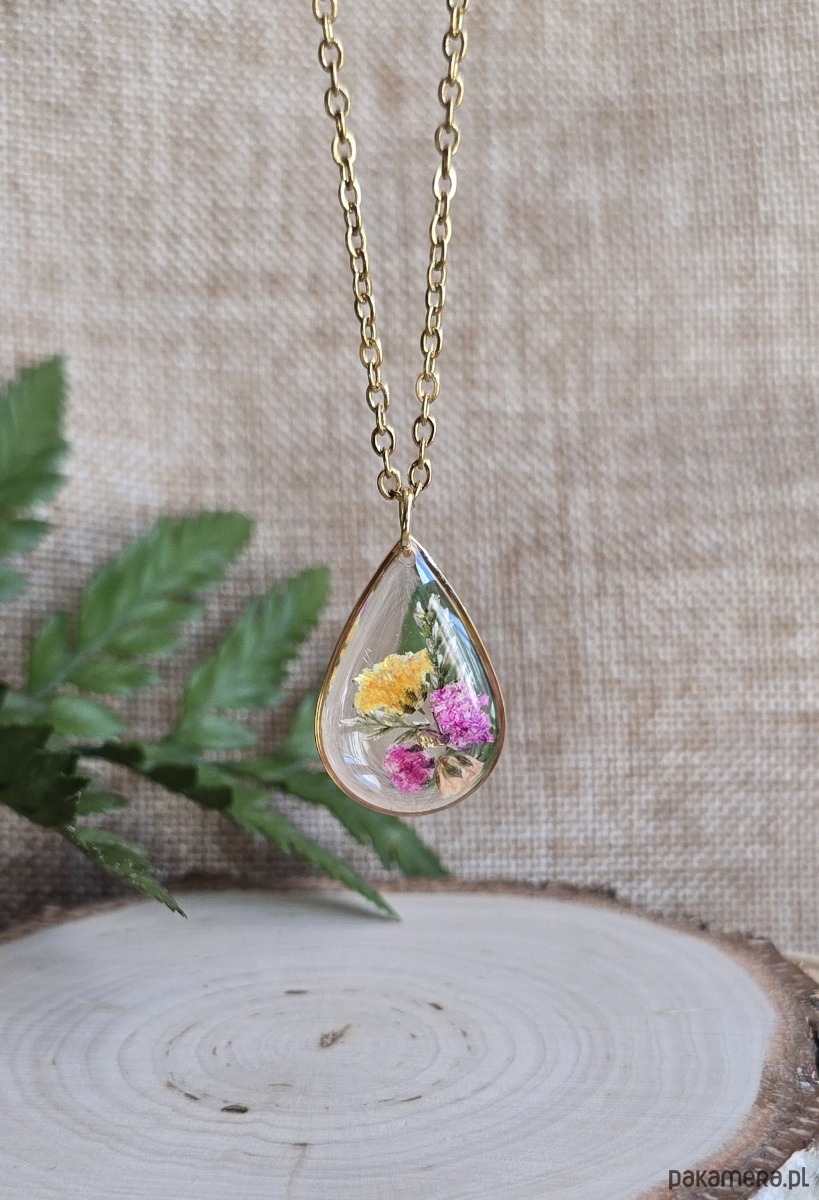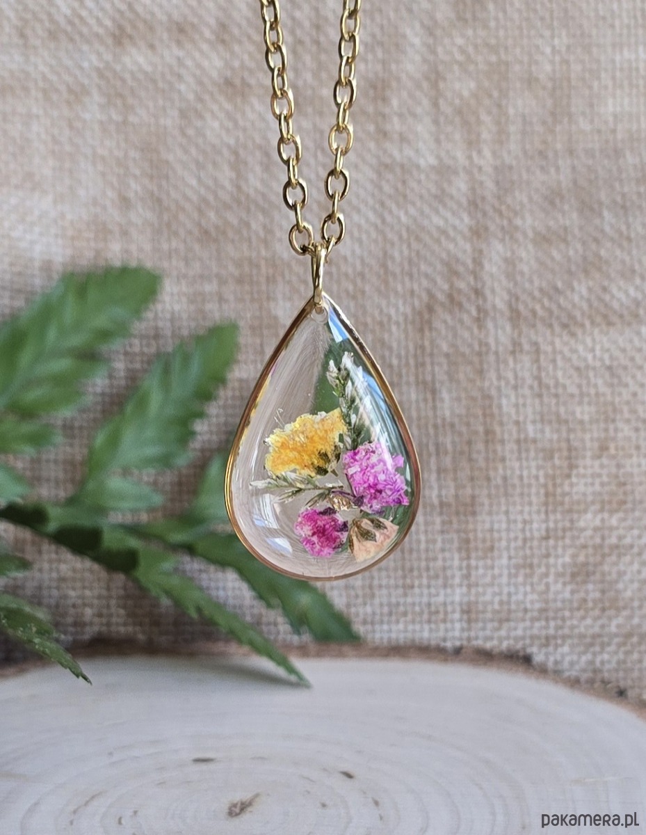 Oferuję Państwu unikalną biżuterię. Zawieszka jest wykonana z suszonych kwiatów i żywicy epoksydowej. Biżuteria jest wspaniałym i oryginalnym prezentem na lata.