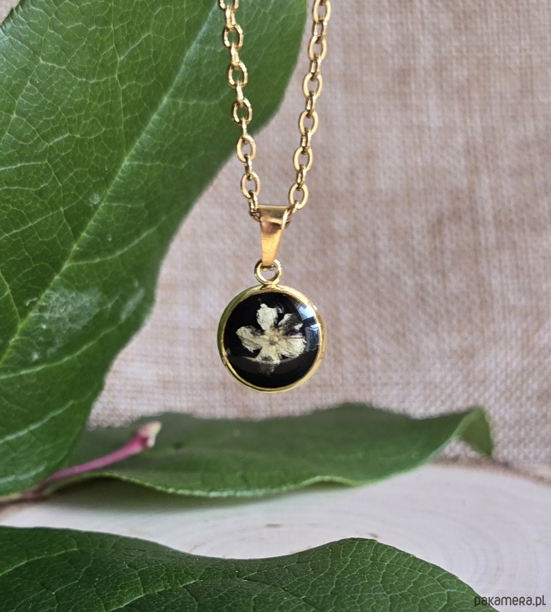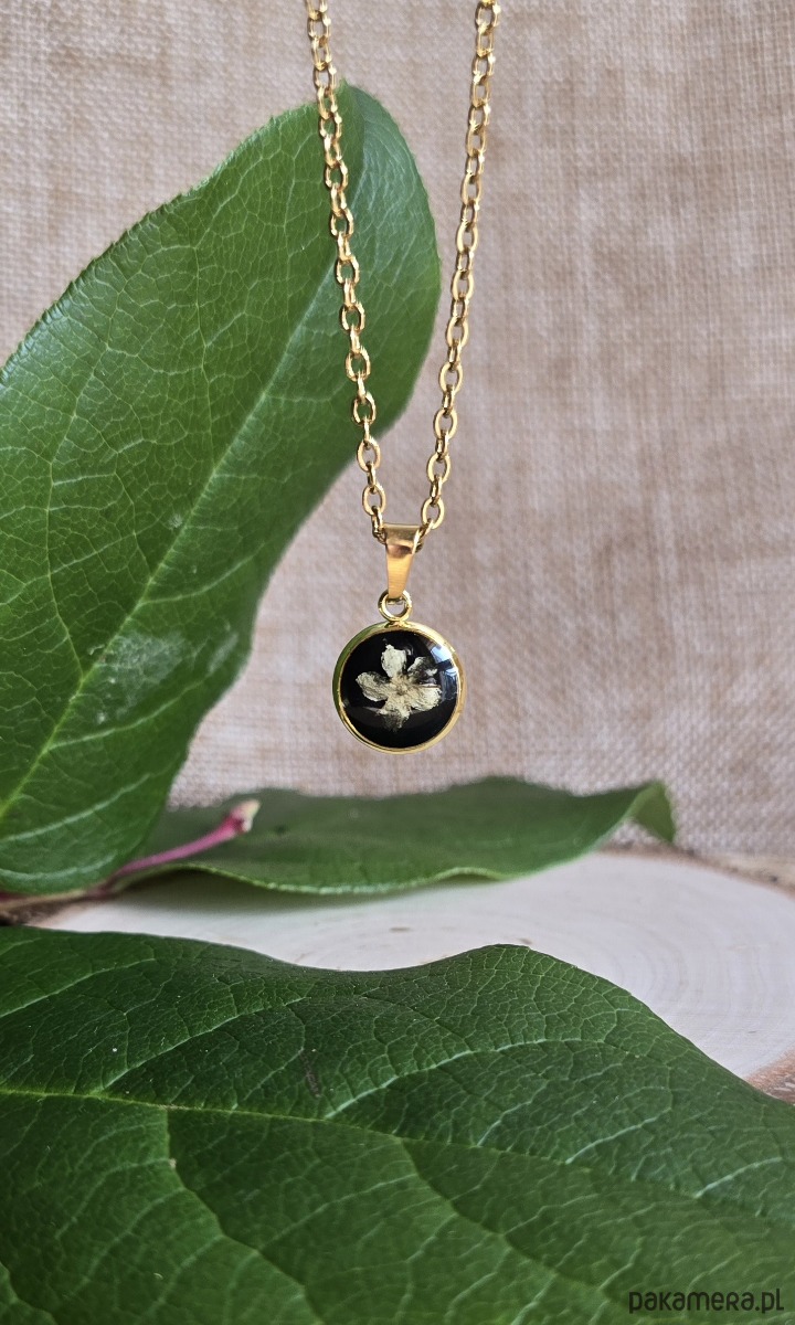 Złoty wisiorek prawdziwe kwiaty zawieszka czarna