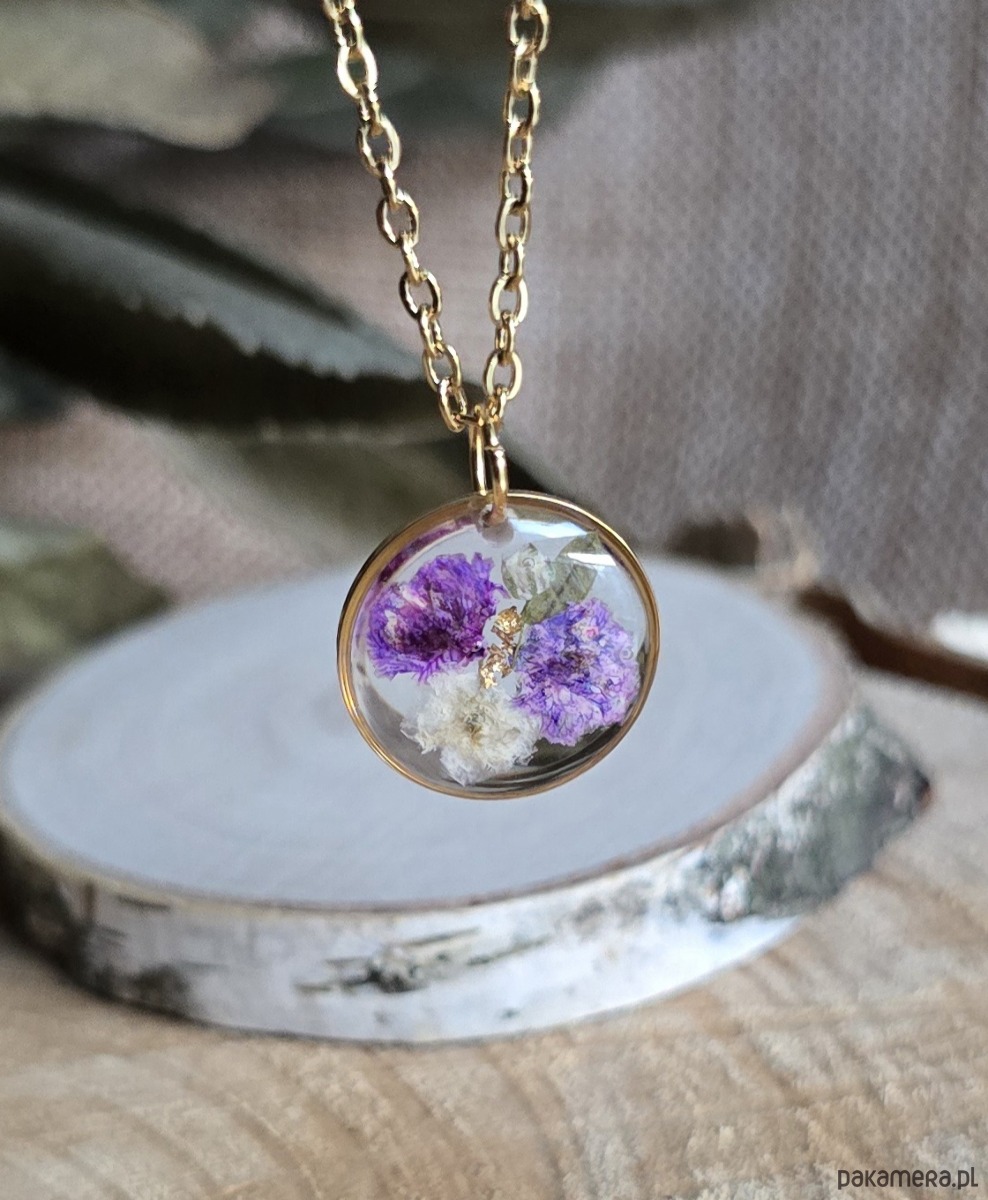 Oferuję Państwu unikalną biżuterię. Zawieszka jest wykonana z suszonych kwiatów i żywicy epoksydowej. Biżuteria jest wspaniałym i oryginalnym prezentem na lata.
