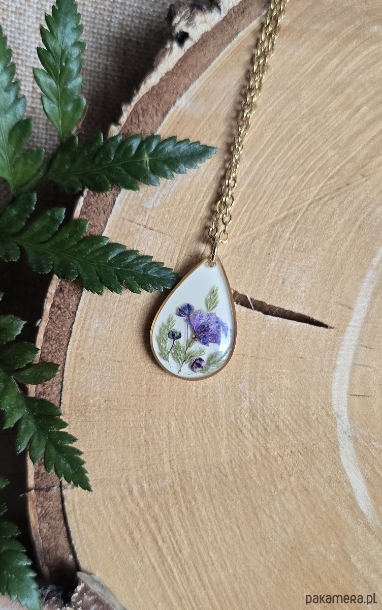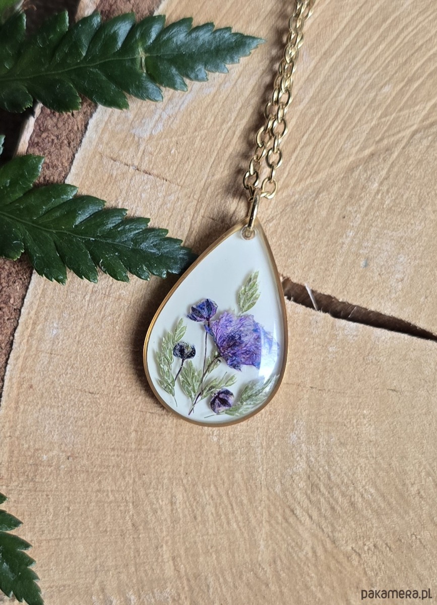 Oferuję Państwu unikalną biżuterię. Zawieszka jest wykonana z suszonych kwiatów i żywicy epoksydowej. Biżuteria jest wspaniałym i oryginalnym prezentem na lata.