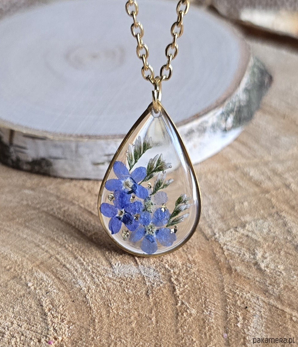 Złoty wisiorek prawdziwe kwiaty zawieszka łezka łza niezapominajki