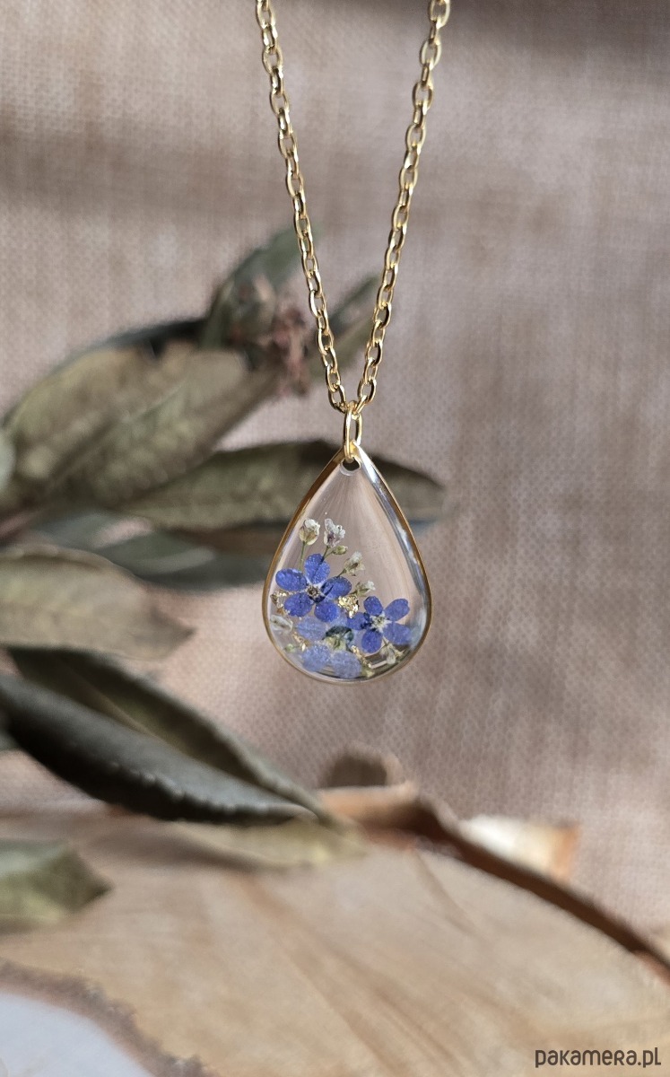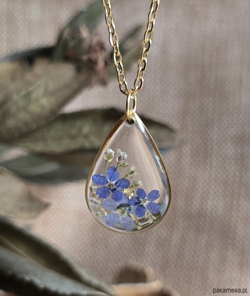 Złoty wisiorek prawdziwe kwiaty zawieszka łezka łza niezapominajki