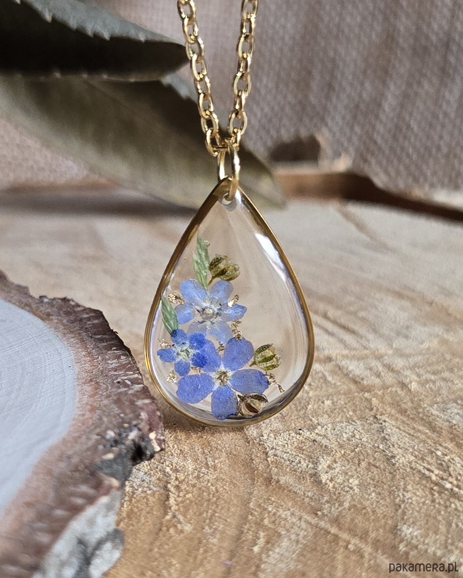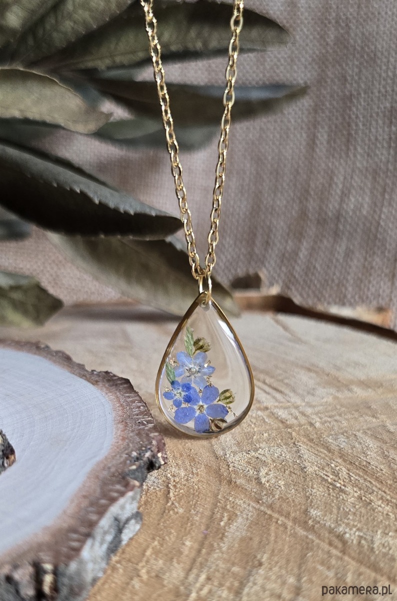 Złoty wisiorek prawdziwe kwiaty zawieszka łezka łza niezapominajki