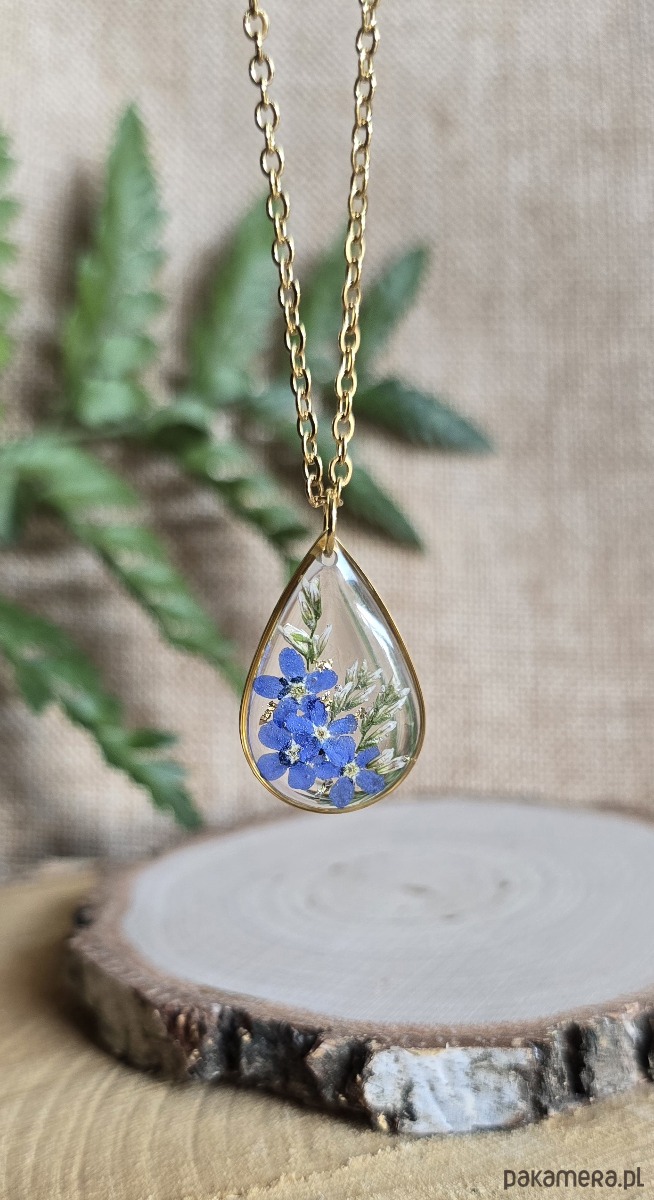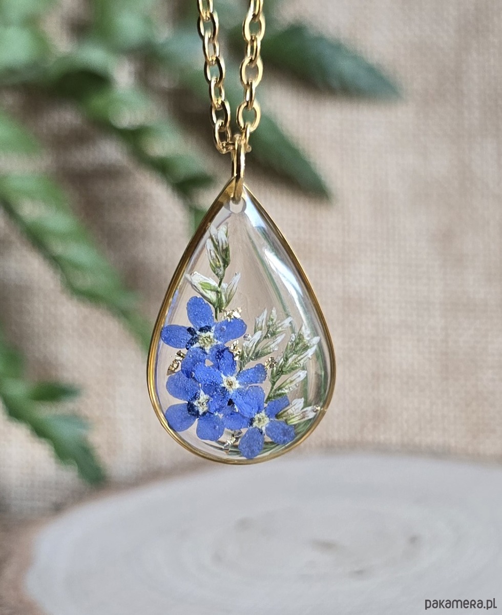 Złoty wisiorek prawdziwe kwiaty zawieszka łezka łza niezapominajki