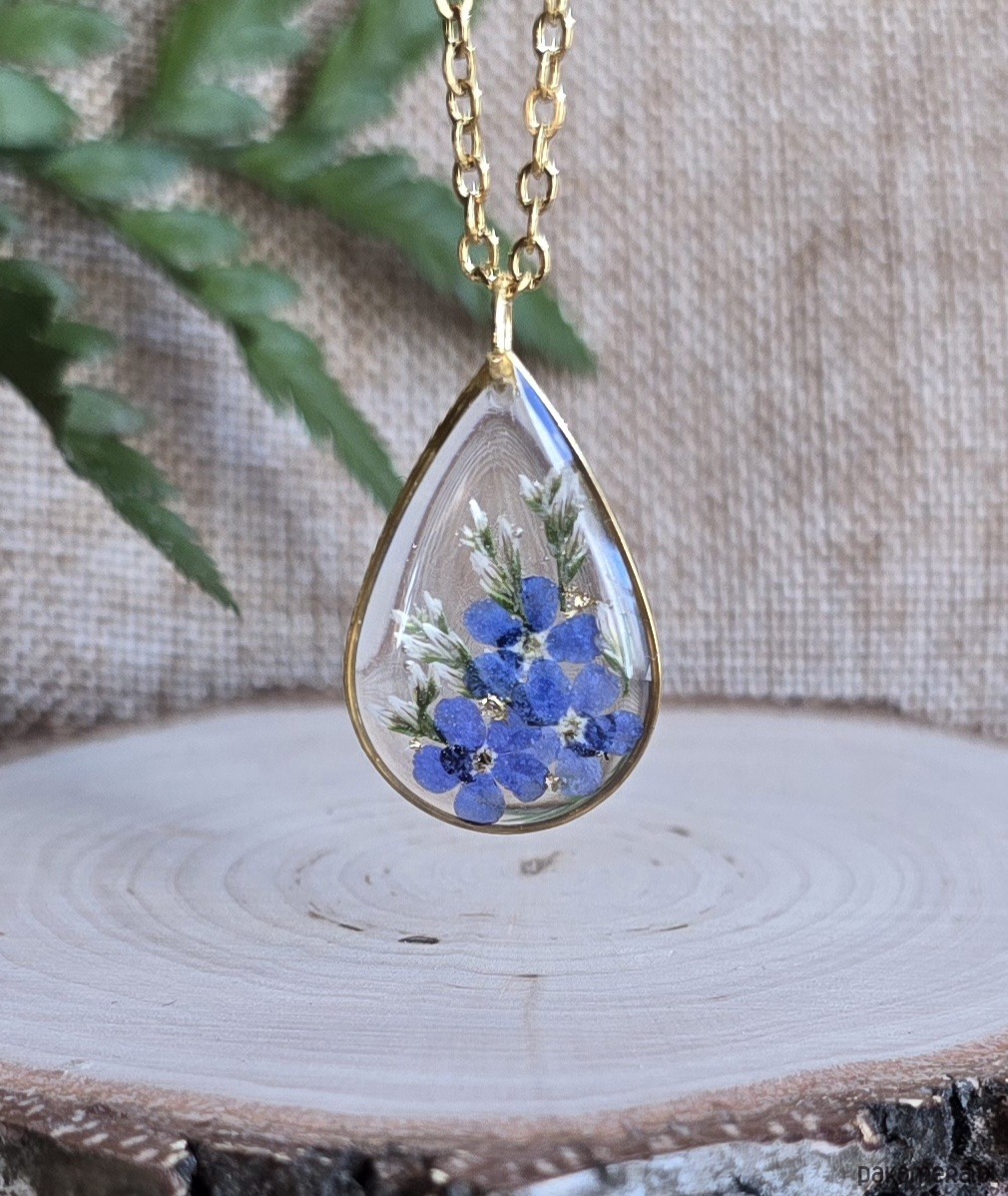 Oferuję Państwu unikalną biżuterię. Zawieszka jest wykonana z suszonych kwiatów i żywicy epoksydowej. Biżuteria jest wspaniałym i oryginalnym prezentem na lata.