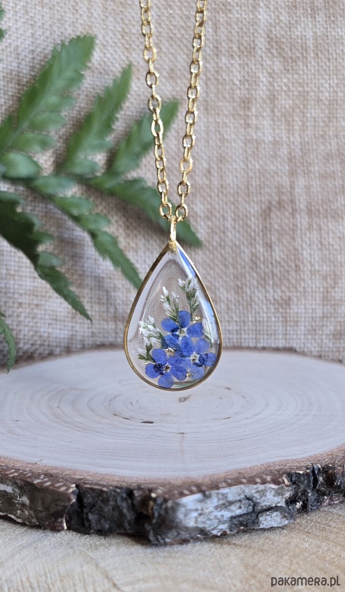 Złoty wisiorek prawdziwe kwiaty zawieszka łezka łza niezapominajki