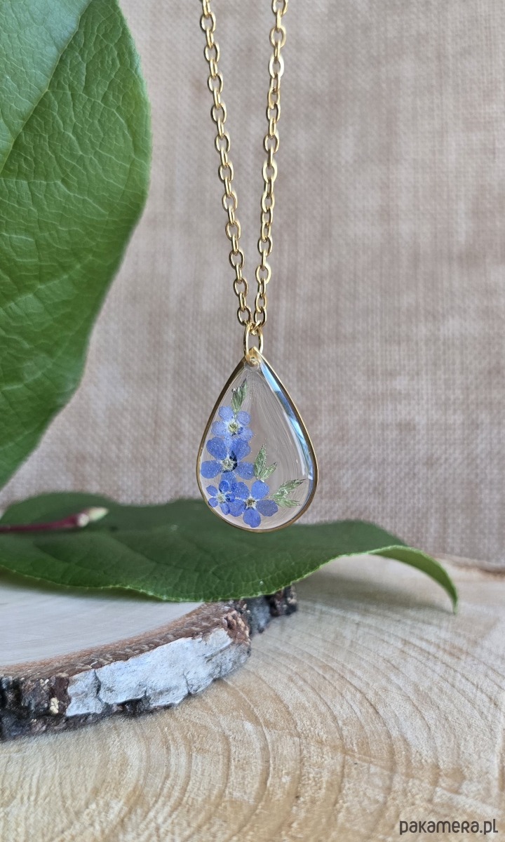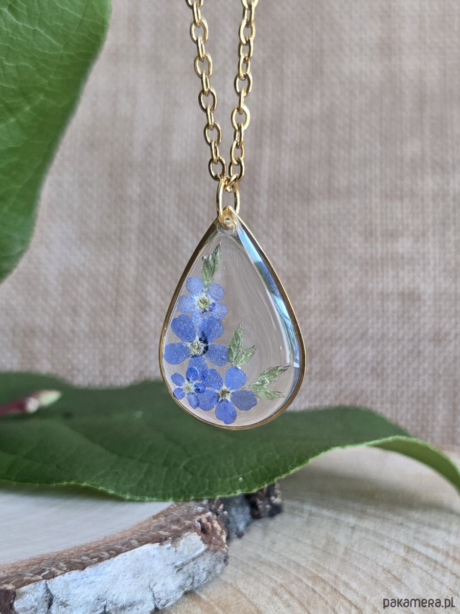 Złoty wisiorek prawdziwe kwiaty zawieszka łezka łza niezapominajki