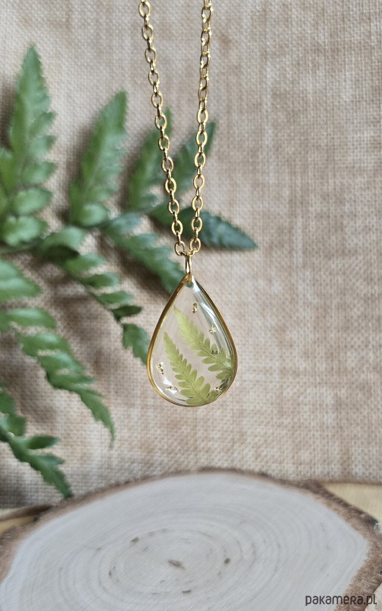 Złoty wisiorek prawdziwe kwiaty zawieszka łezka łza paproć