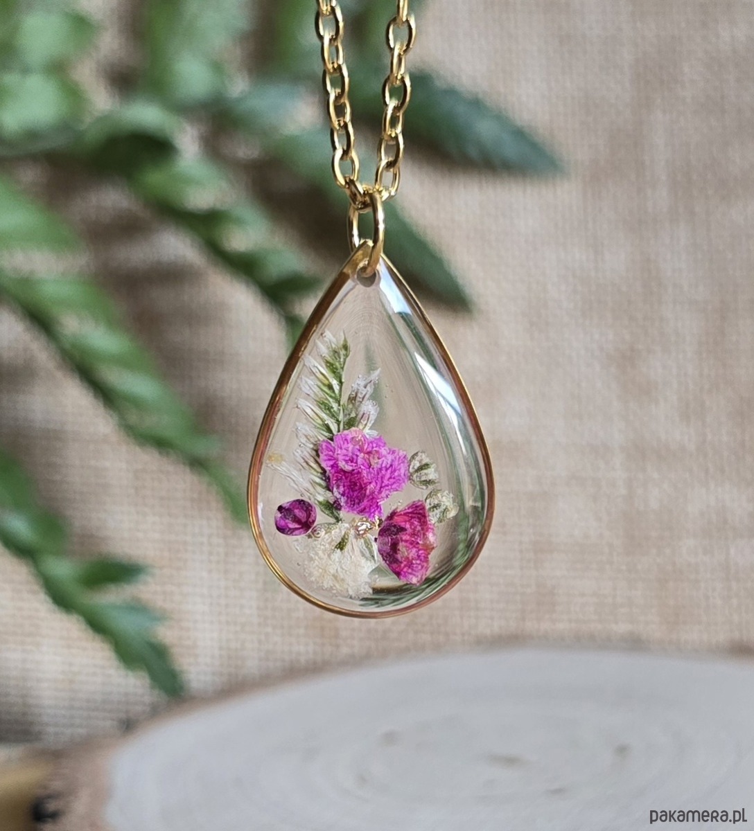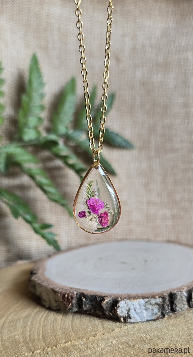 Oferuję Państwu unikalną biżuterię. Zawieszka jest wykonana z suszonych kwiatów i żywicy epoksydowej. Biżuteria jest wspaniałym i oryginalnym prezentem na lata.