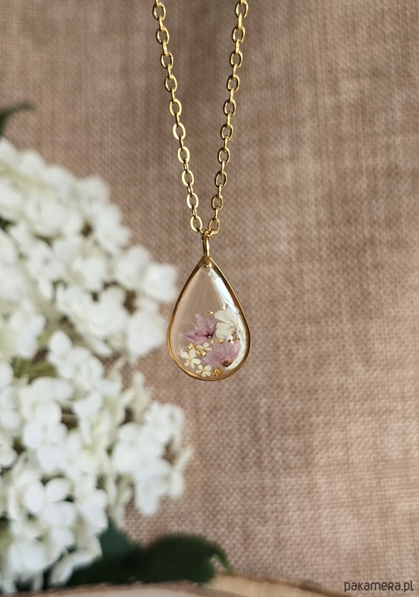 Złoty wisiorek prawdziwe kwiaty zawieszka łezka łza wrzos różowa