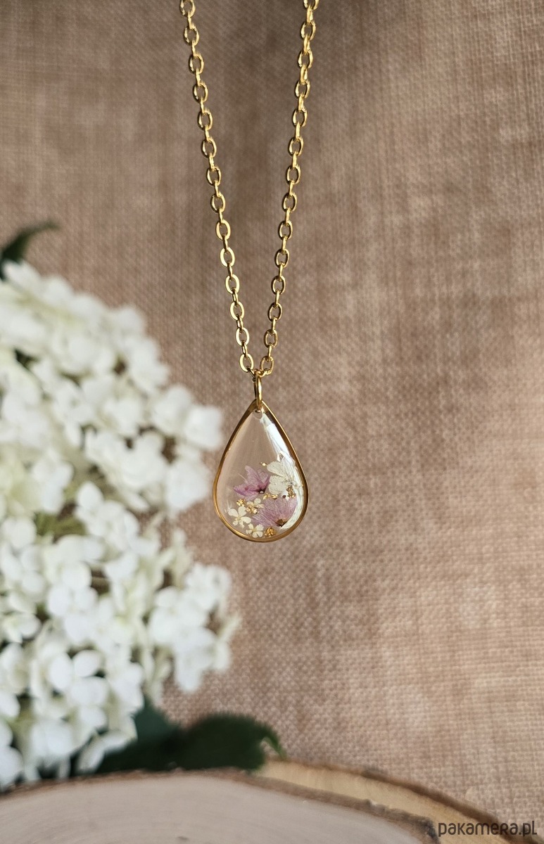 Oferuję Państwu unikalną biżuterię. Zawieszka jest wykonana z suszonych kwiatów i żywicy epoksydowej. Biżuteria jest wspaniałym i oryginalnym prezentem na lata.
