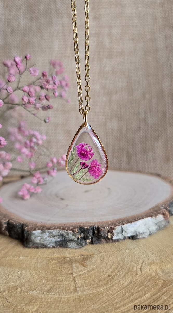 Złoty wisiorek prawdziwe kwiaty zawieszka łezka łza różowa