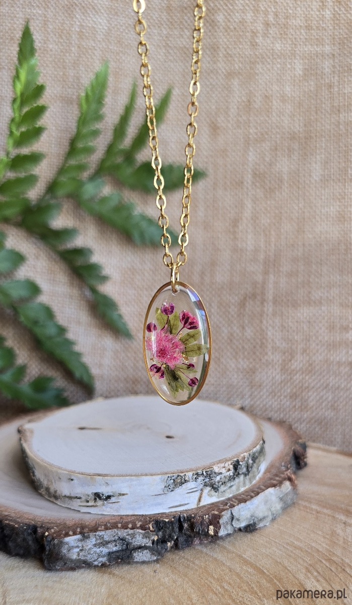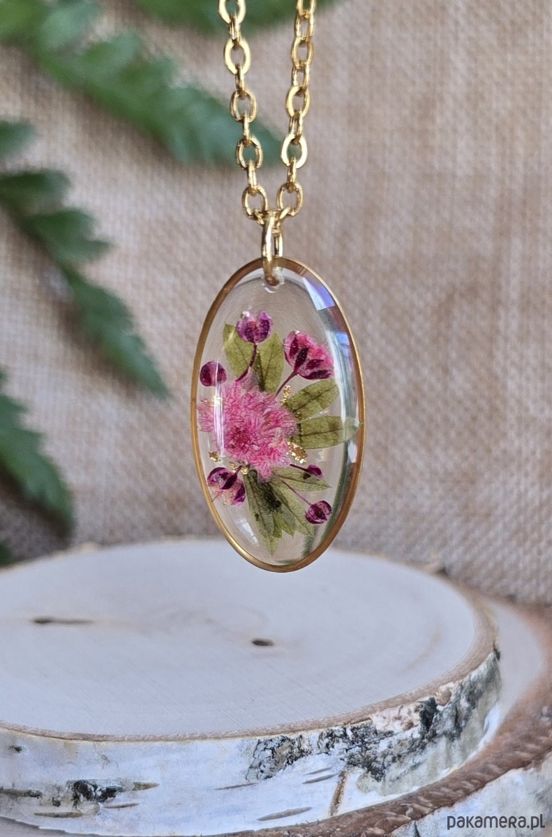 Oferuję Państwu unikalną biżuterię. Zawieszka jest wykonana z suszonych kwiatów i żywicy epoksydowej. Biżuteria jest wspaniałym i oryginalnym prezentem na lata.