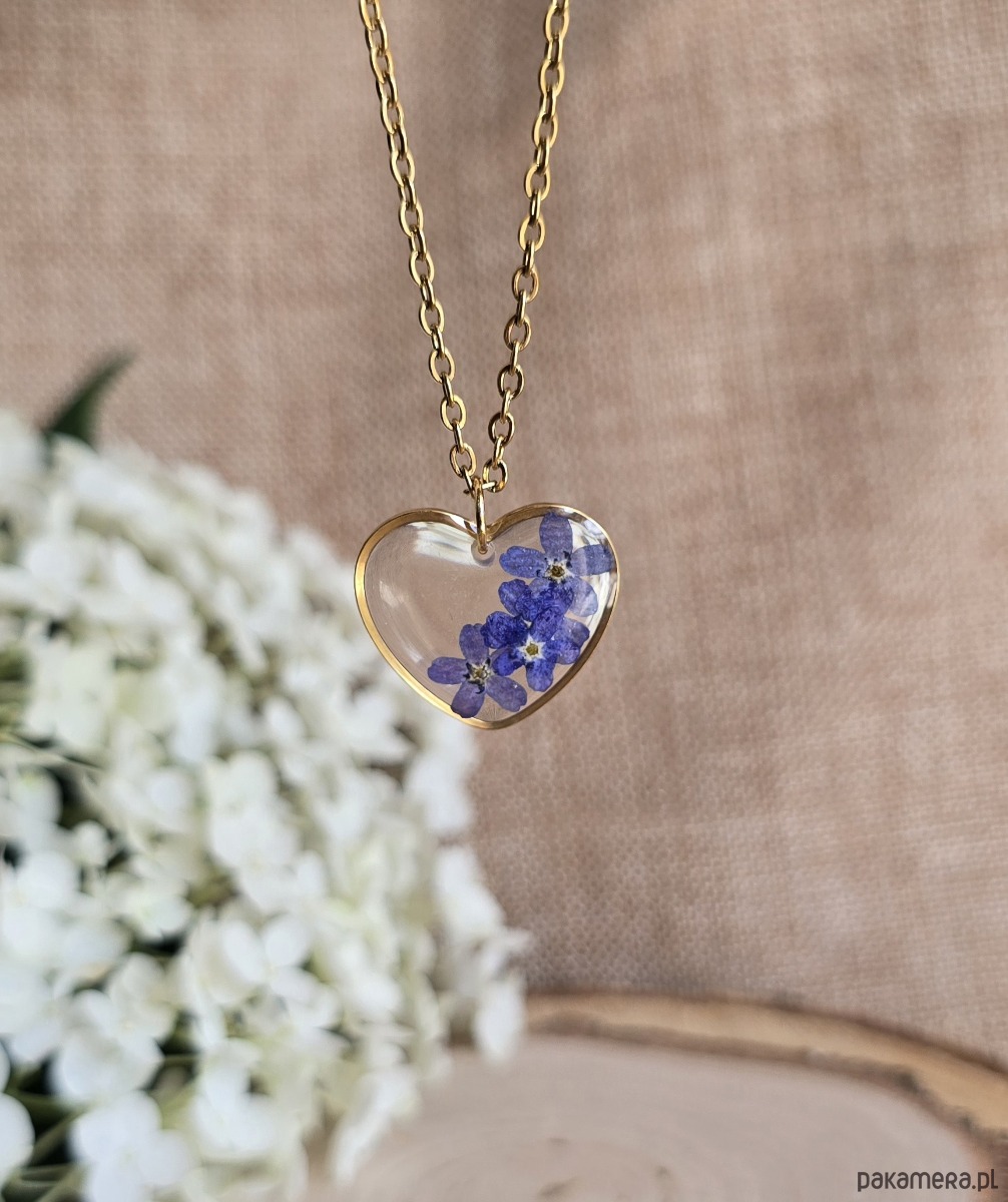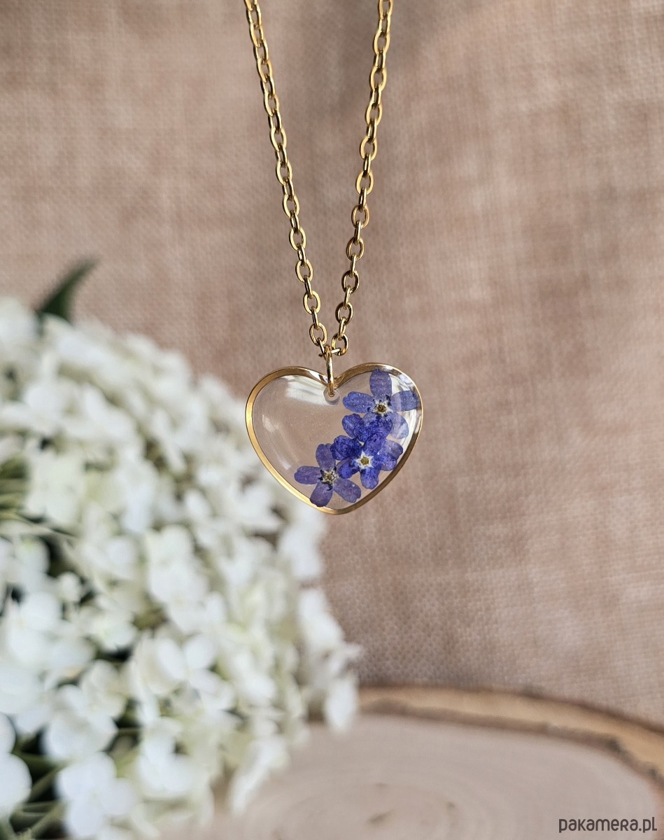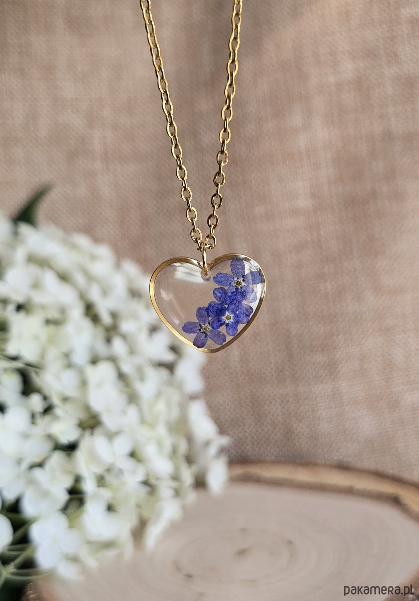 Złoty wisiorek prawdziwe kwiaty zawieszka serce serduszko niezapominajka