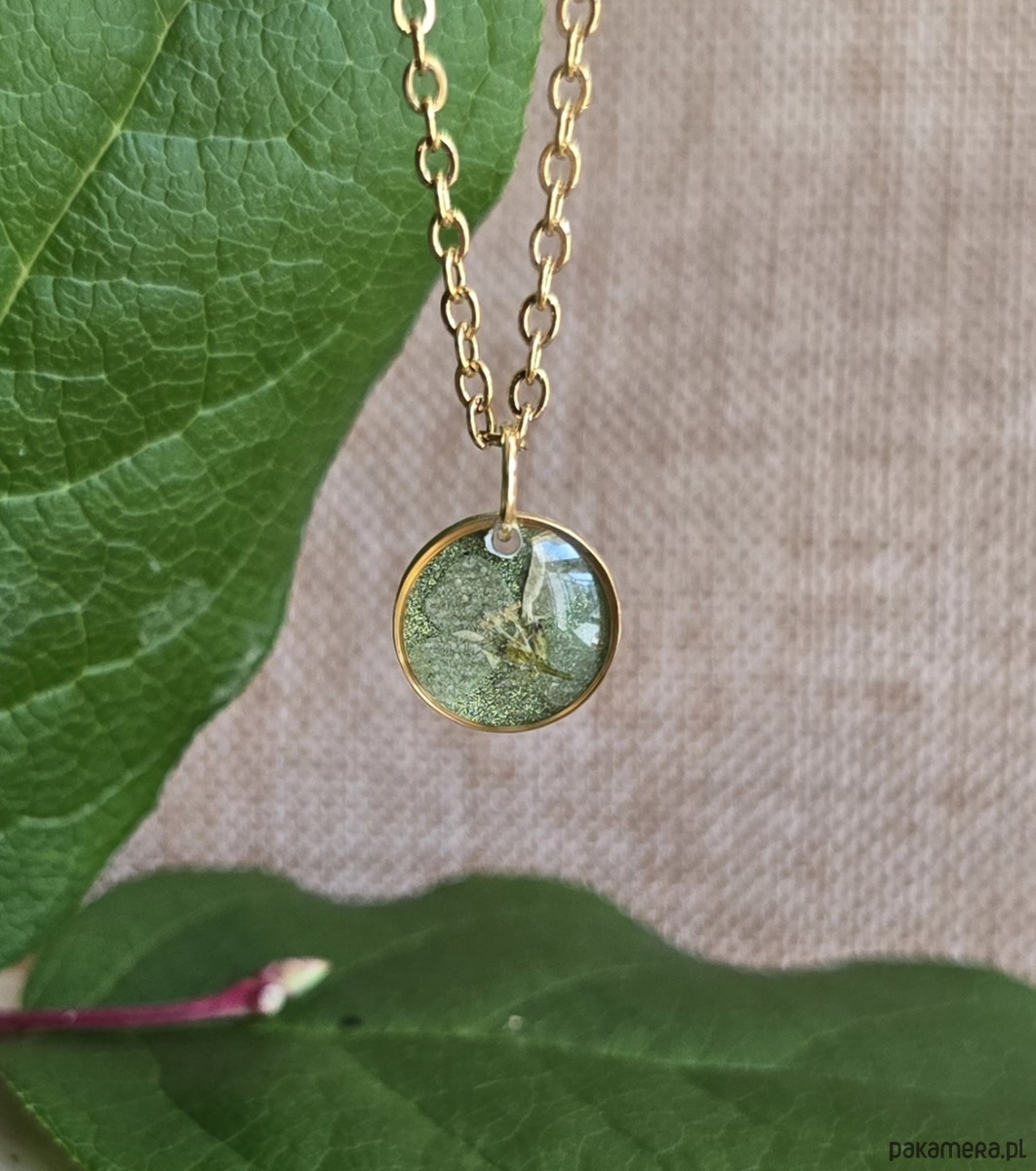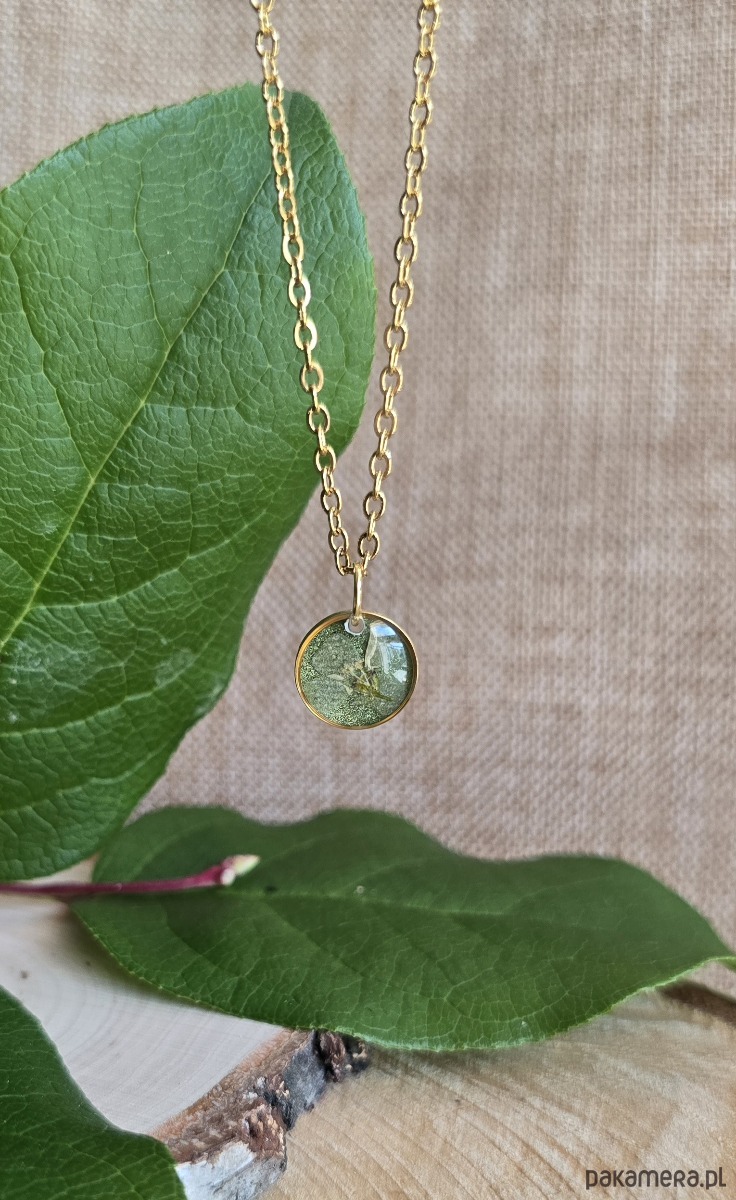 Złoty wisiorek prawdziwe kwiaty zawieszka zielona