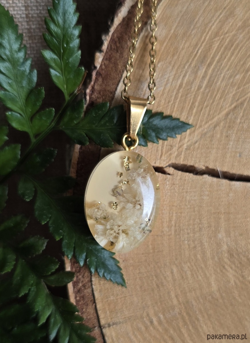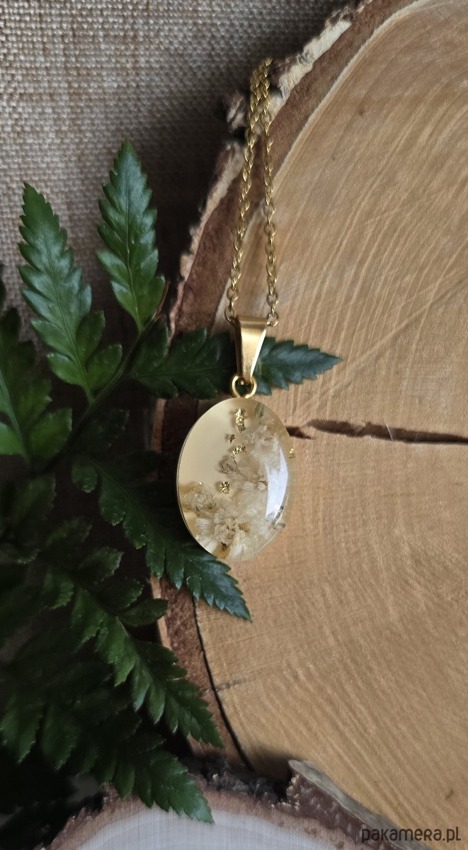 Oferuję Państwu unikalną biżuterię. Zawieszka jest wykonana z suszonych kwiatów i żywicy epoksydowej. Biżuteria jest wspaniałym i oryginalnym prezentem na lata.