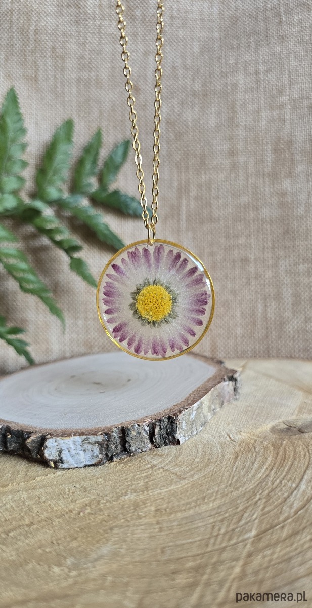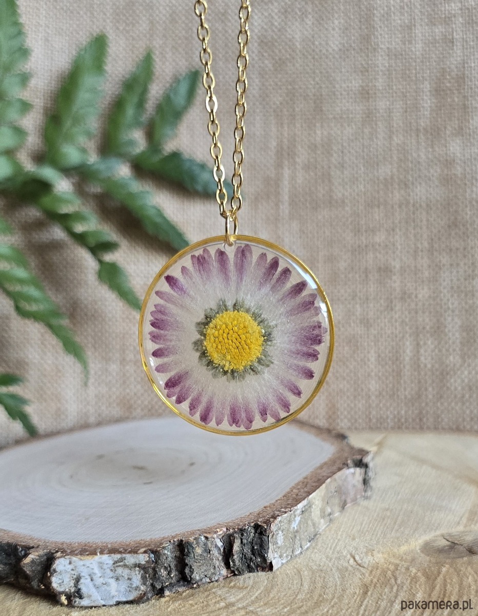 Oferuję Państwu unikalną biżuterię. Zawieszka jest wykonana z suszonych kwiatów i żywicy epoksydowej. Biżuteria jest wspaniałym i oryginalnym prezentem na lata.