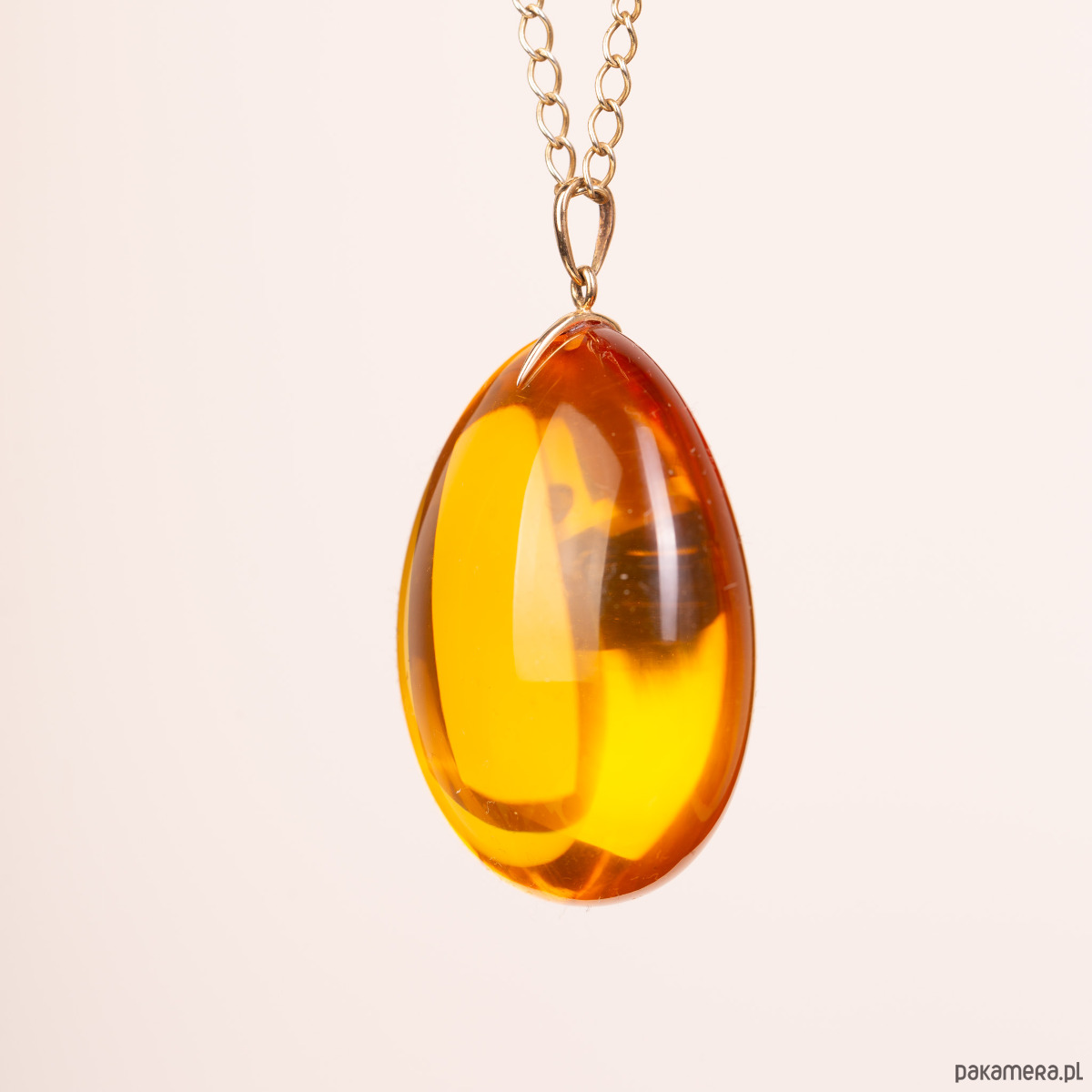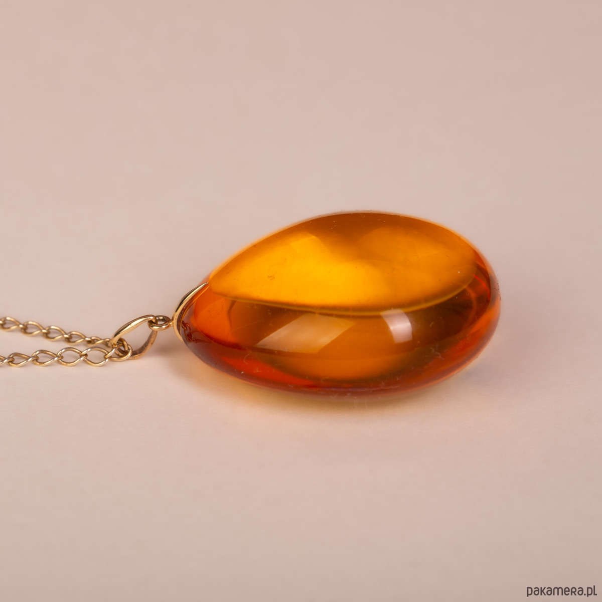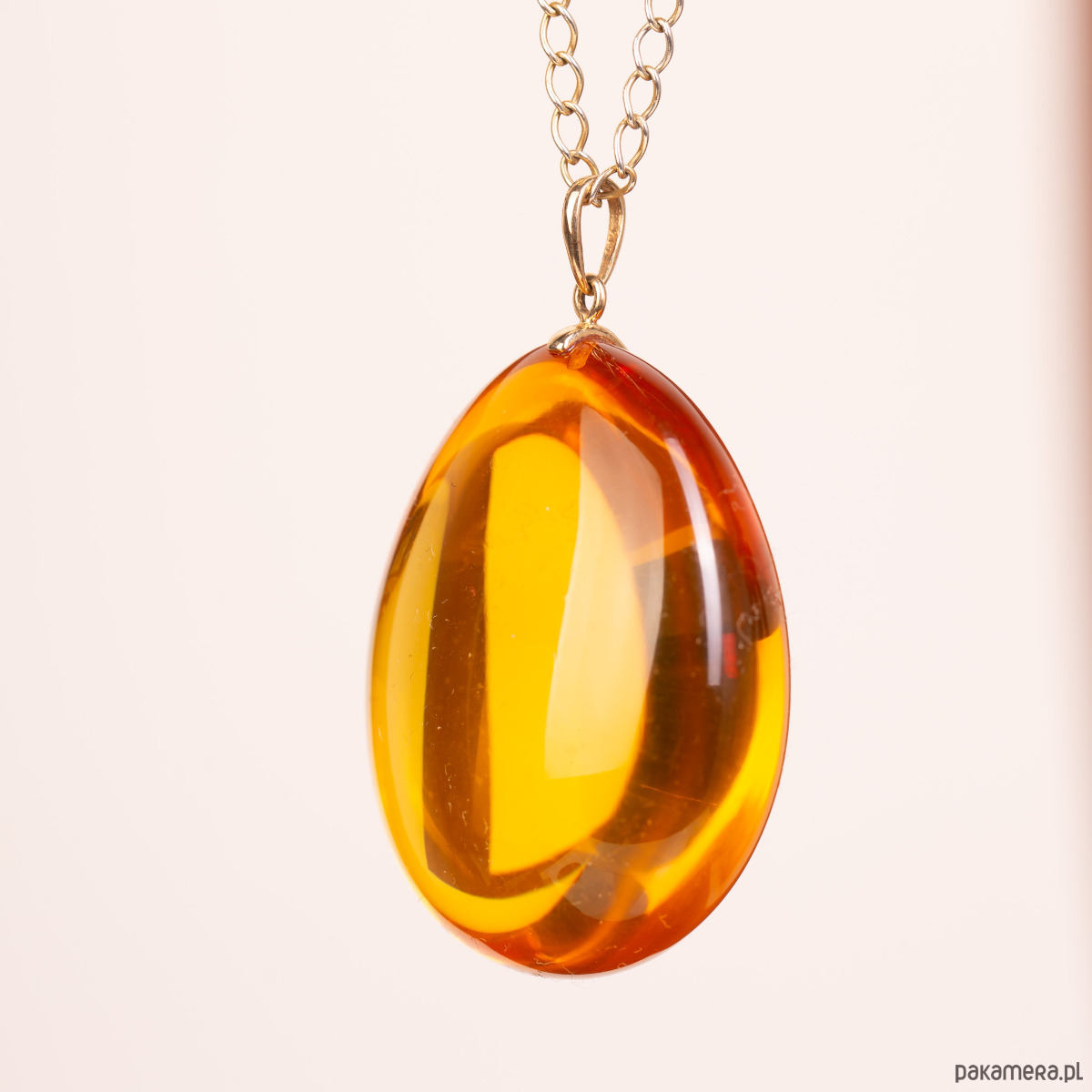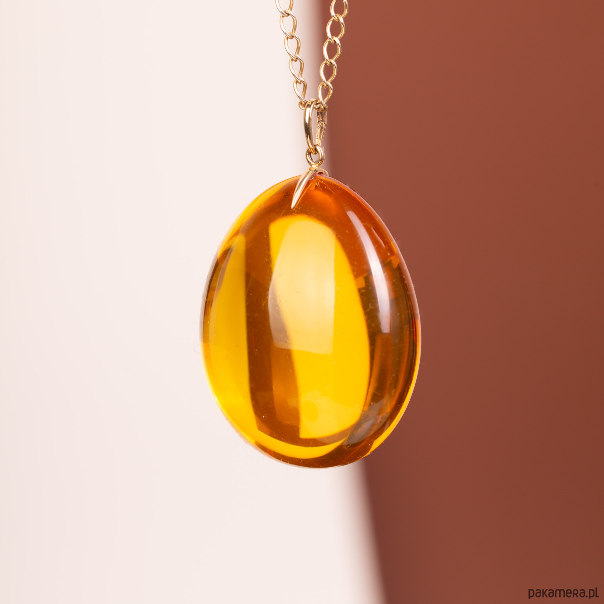 Spektakularny wisiorek o pełnej, wypukłej formie, wykonany z klarowanego bursztynu bałtyckiego o głębokiej, miodowej barwie. Bursztyn zachwyca swoją objętością i nieskazitelną przejrzystością, która sprawia, że bryła zdaje się promieniować wewnętrznym blaskiem. Szlachetna zawieszka z 14-karatowego złota (próba 585) stanowi minimalistyczne, a zarazem luksusowe dopełnienie tej imponującej, trójwymiarowej formy.