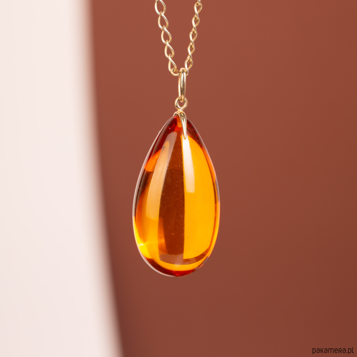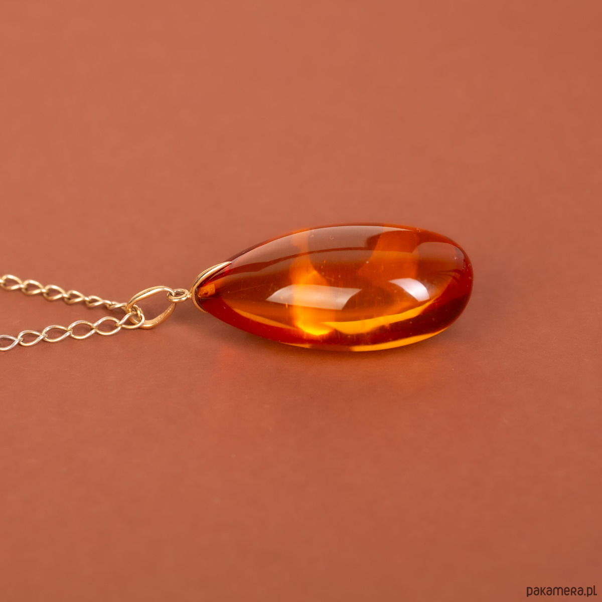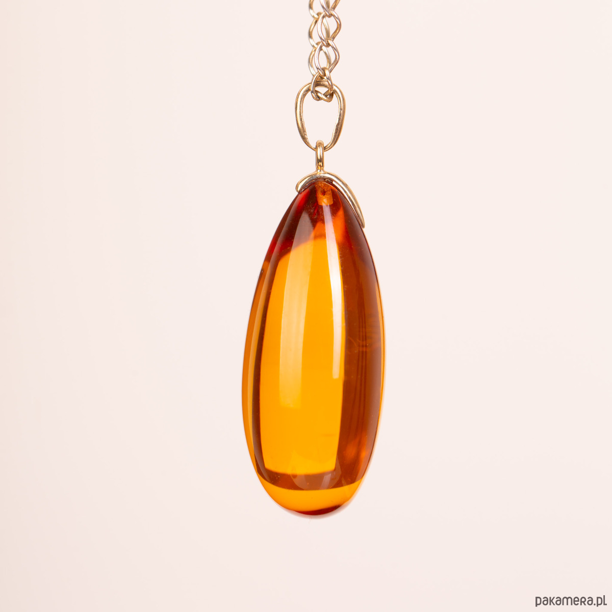 Klasyczny i niezwykle elegancki wisiorek wykonany z klarowanego bursztynu bałtyckiego o głębokim, miodowym odcieniu. Bursztyn o formie smukłej kropli charakteryzuje się wyjątkową przejrzystością, która pozwala światłu swobodnie przenikać przez jego wnętrze, wydobywając złociste refleksy. Szlachetna oprawa w postaci minimalistycznej krawatki z 14-karatowego złota (próba 585) podkreśla prestiżowy charakter tej artystycznej biżuterii.