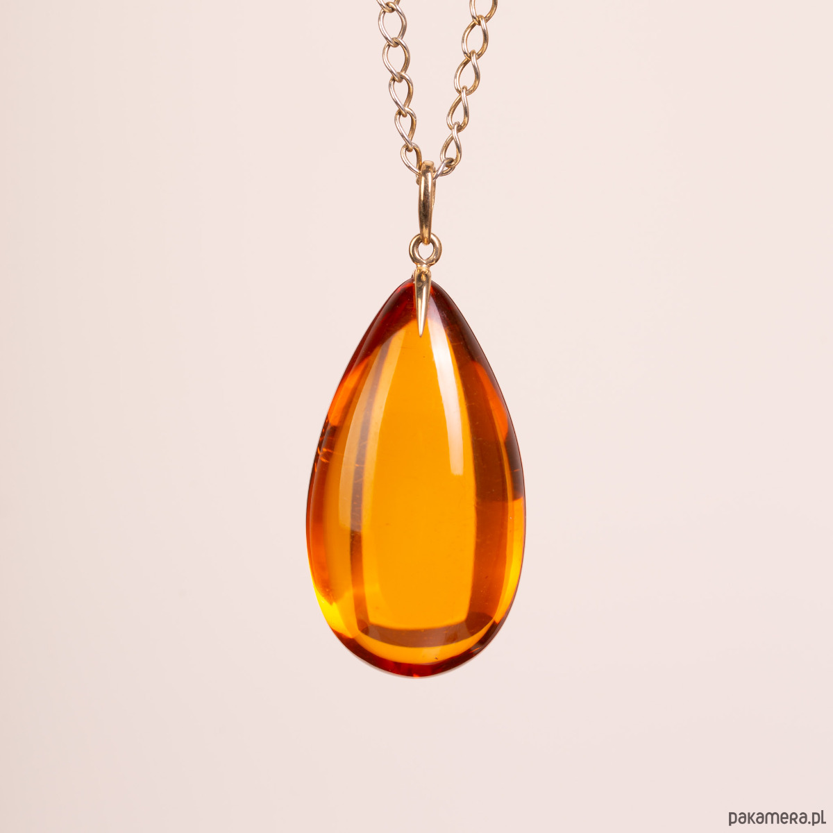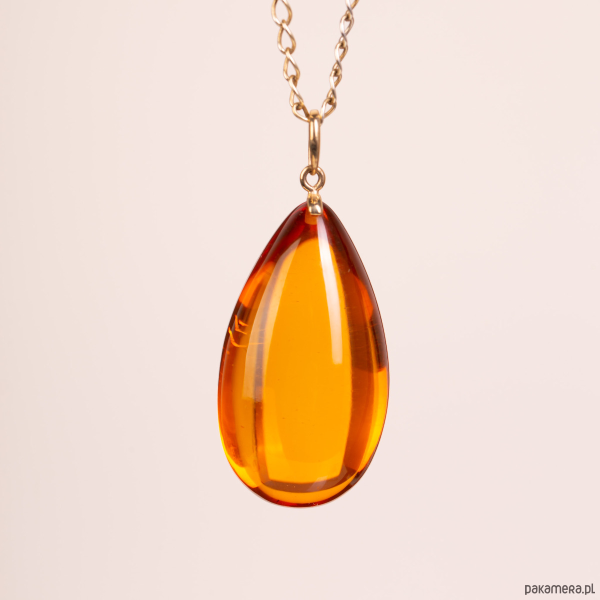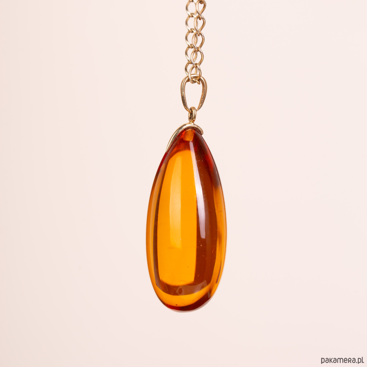 Klasyczny i niezwykle elegancki wisiorek wykonany z klarowanego bursztynu bałtyckiego o głębokim, miodowym odcieniu. Bursztyn o formie smukłej kropli charakteryzuje się wyjątkową przejrzystością, która pozwala światłu swobodnie przenikać przez jego wnętrze, wydobywając złociste refleksy. Szlachetna oprawa w postaci minimalistycznej krawatki z 14-karatowego złota (próba 585) podkreśla prestiżowy charakter tej artystycznej biżuterii.