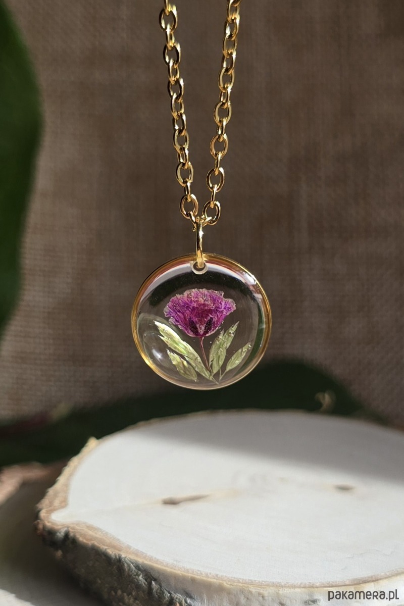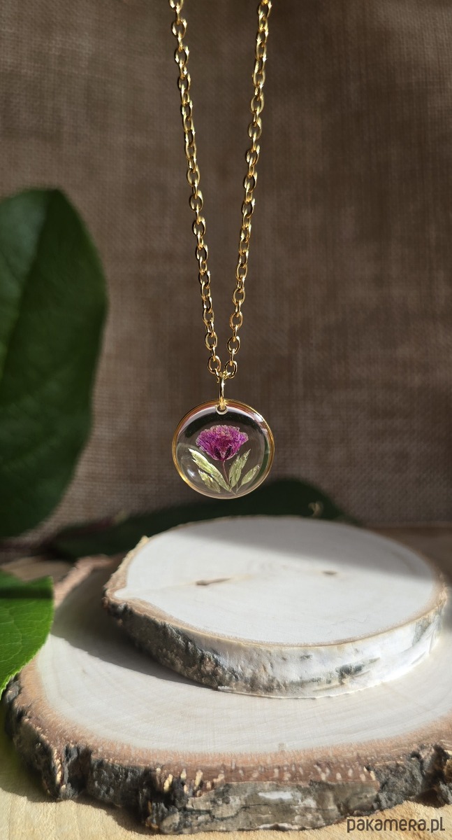 Oferuję Państwu unikalną biżuterię. Zawieszka jest wykonana z suszonych kwiatów i żywicy epoksydowej. Biżuteria jest wspaniałym i oryginalnym prezentem na lata.