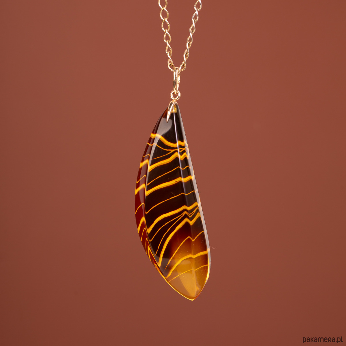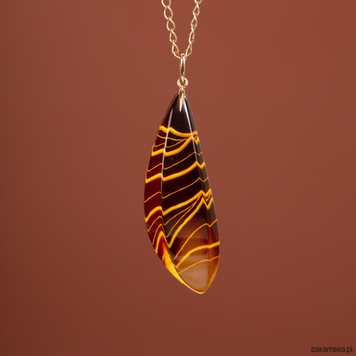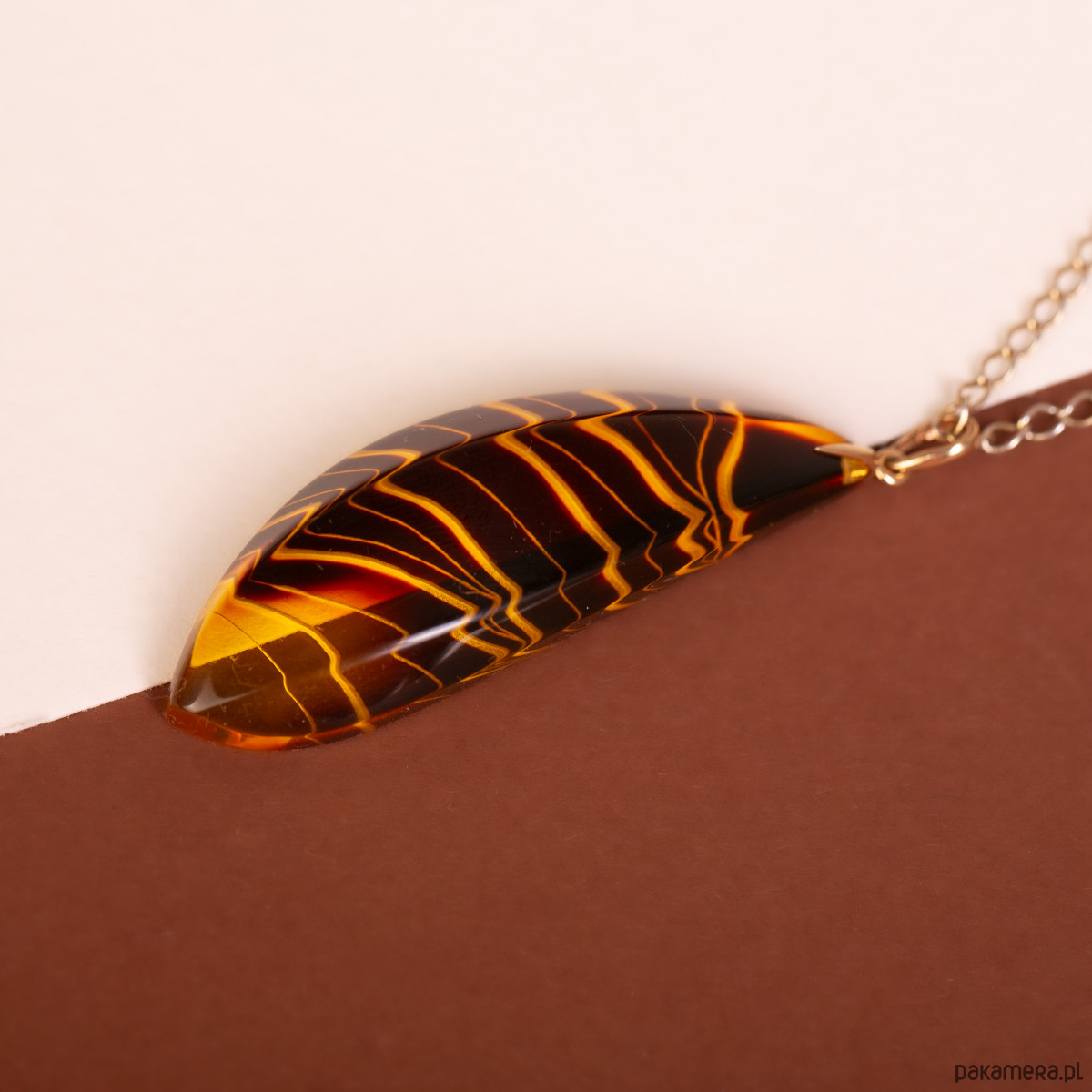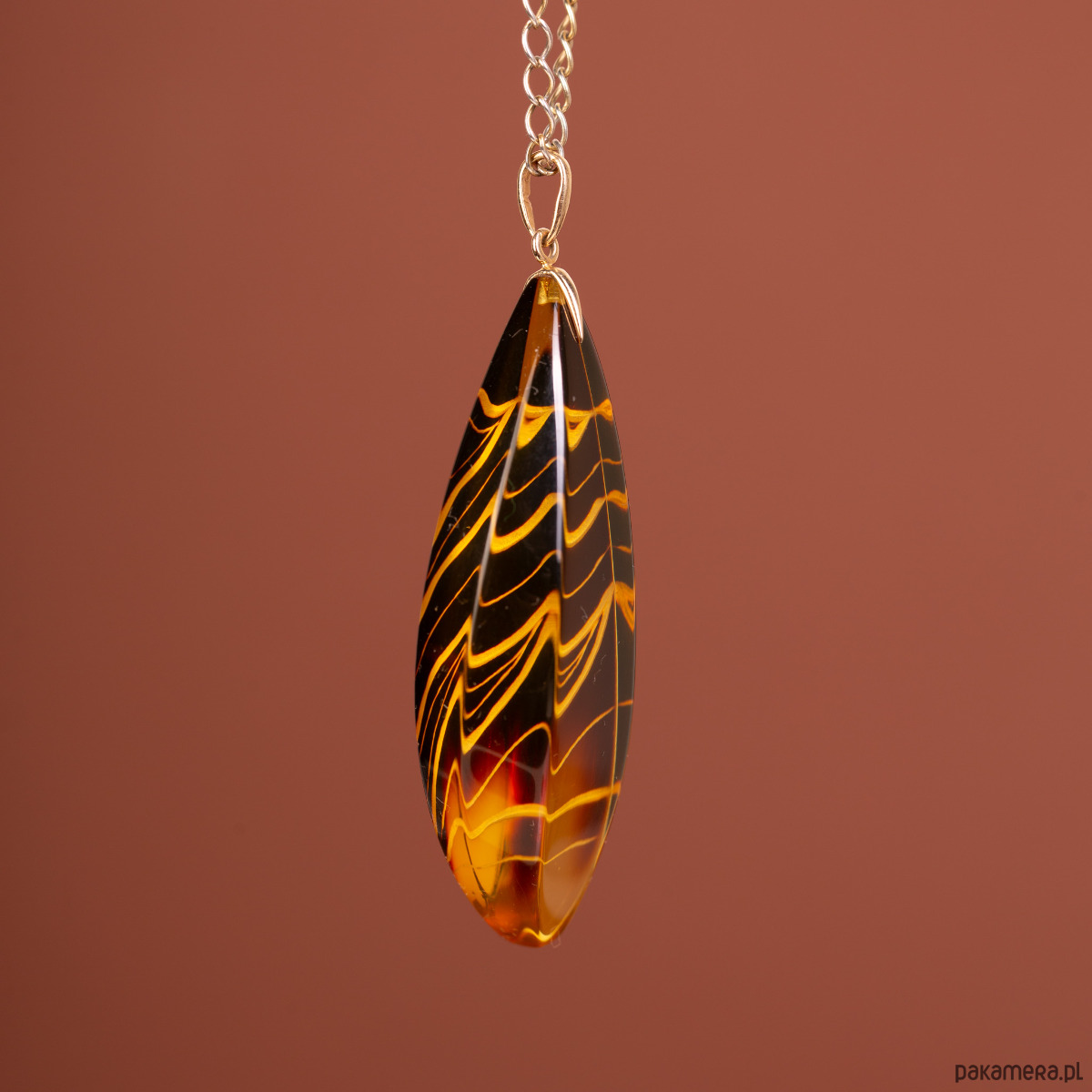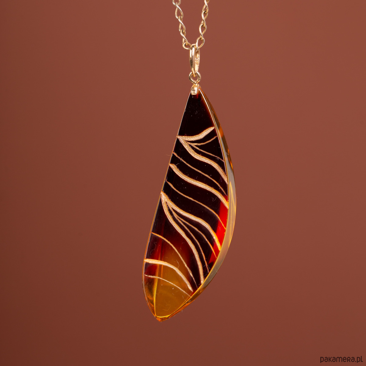 Luksusowy wisiorek wykonany z 14-karatowego złota (próba 585), w którym osadzono misternie rzeźbiony bursztyn bałtycki. Bursztyn został poddany procesowi barwienia, co pozwoliło uzyskać głęboki, ciemnobrązowy odcień, stanowiący idealne tło dla wyrzeźbionych, złocistych linii. Dynamiczny wzór przypomina strukturę pióra, a gra świateł na nacięciach wydobywa z wnętrza bursztynu niesamowitą głębię.