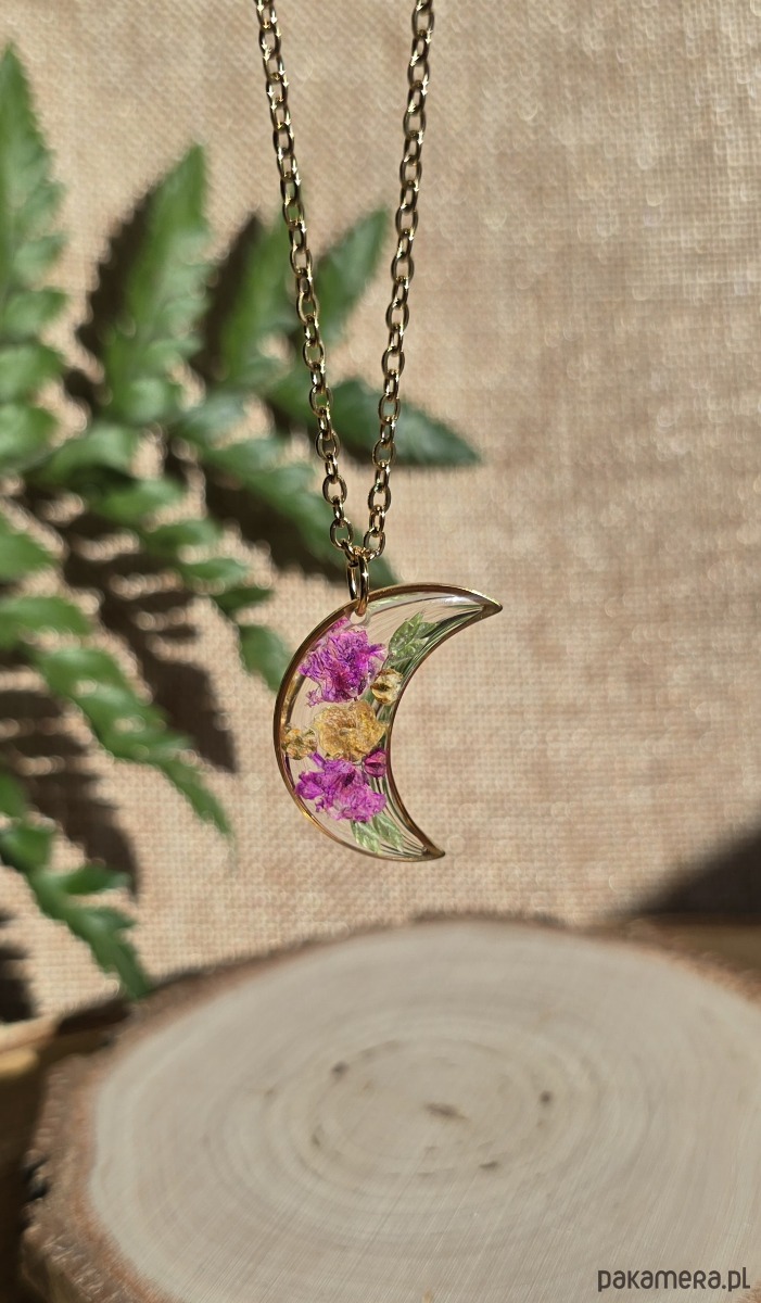 Złoty wisiorek złota zawieszka księżyc suszone kwiaty