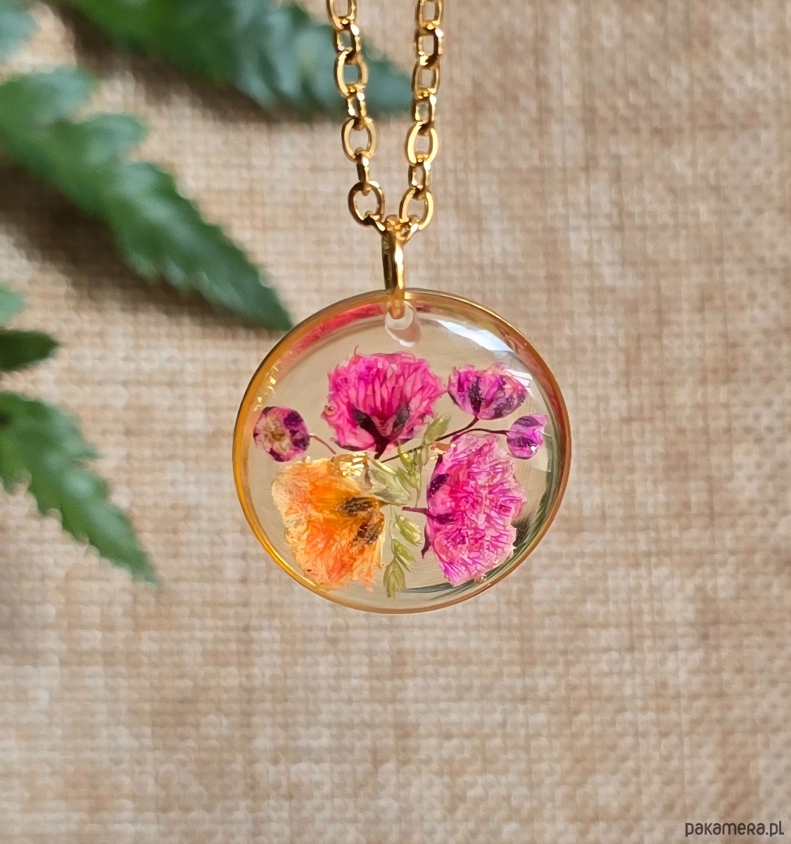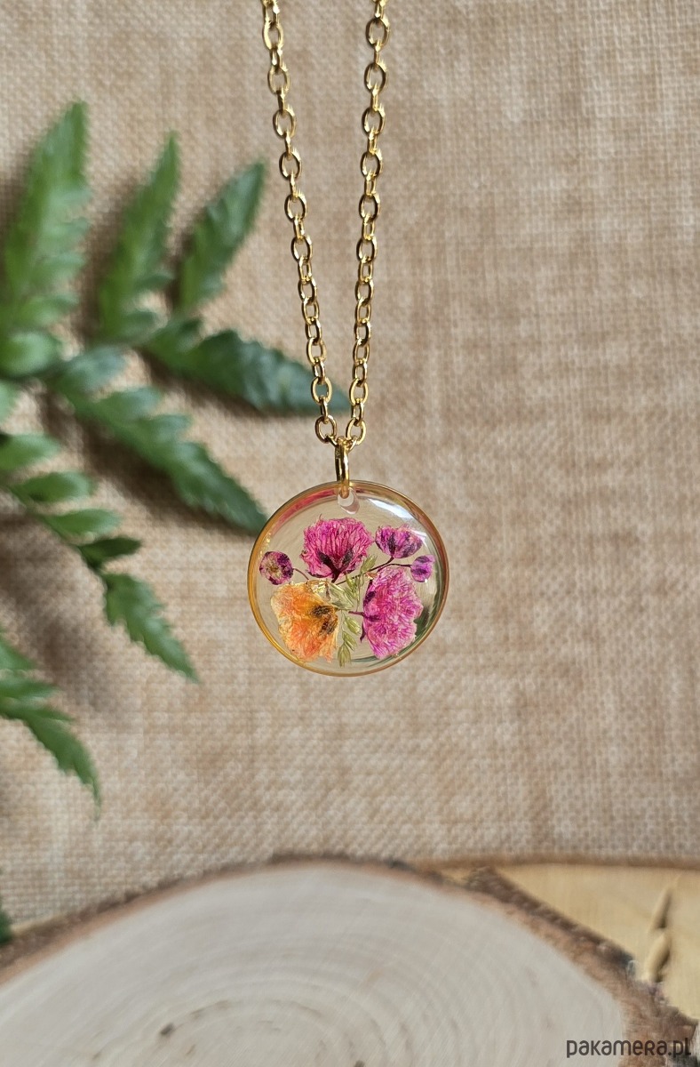 Oferuję Państwu unikalną biżuterię. Zawieszka jest wykonana z suszonych kwiatów i żywicy epoksydowej. Biżuteria jest wspaniałym i oryginalnym prezentem na lata.