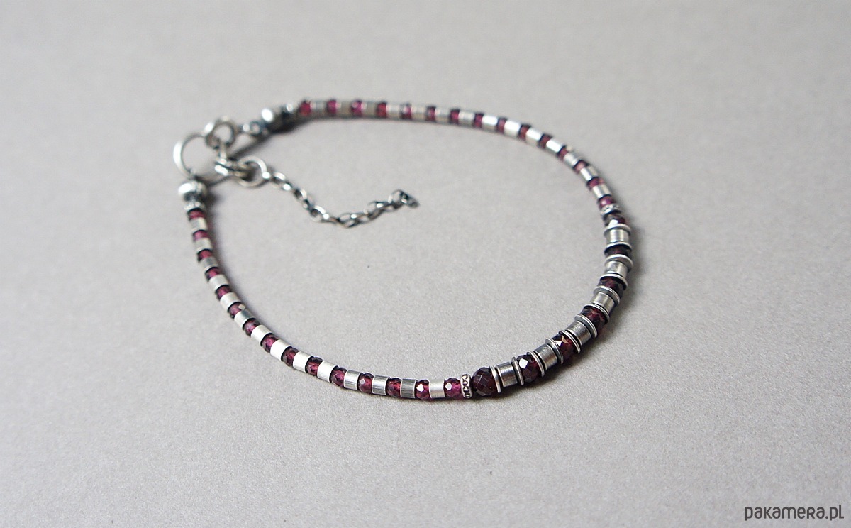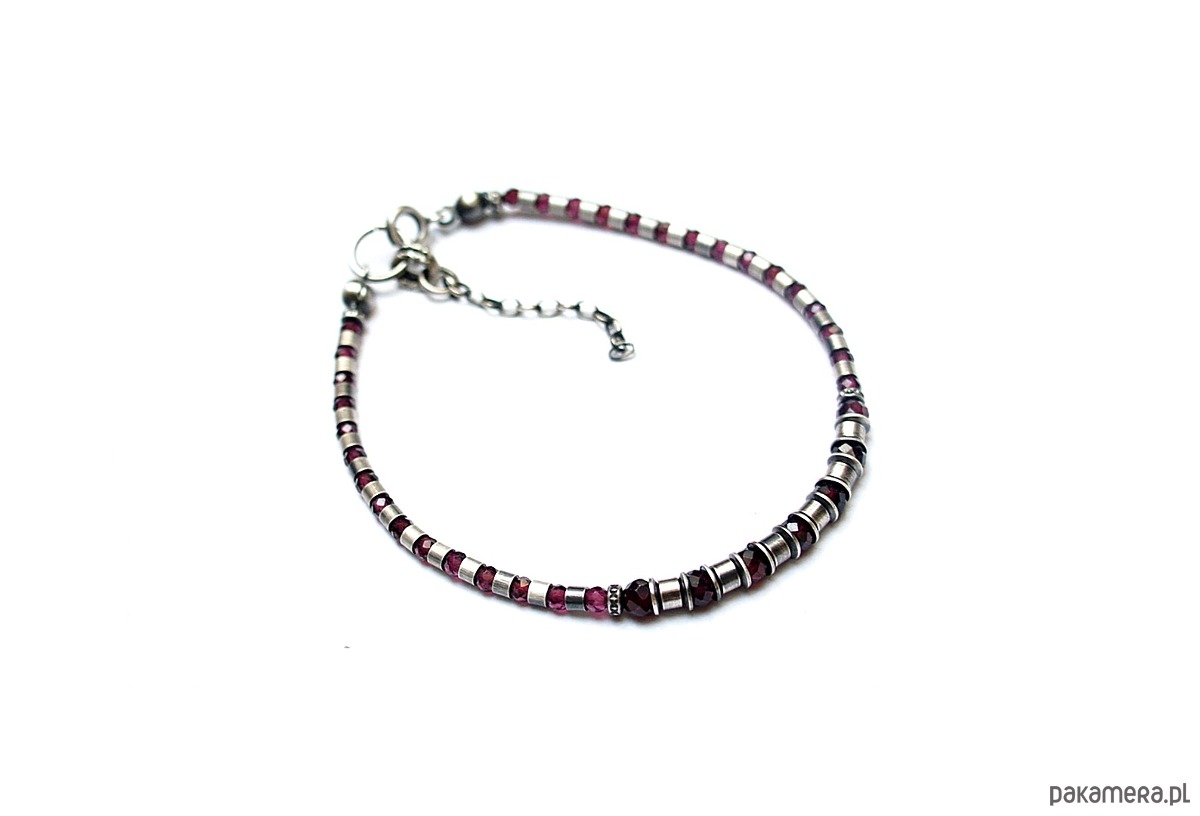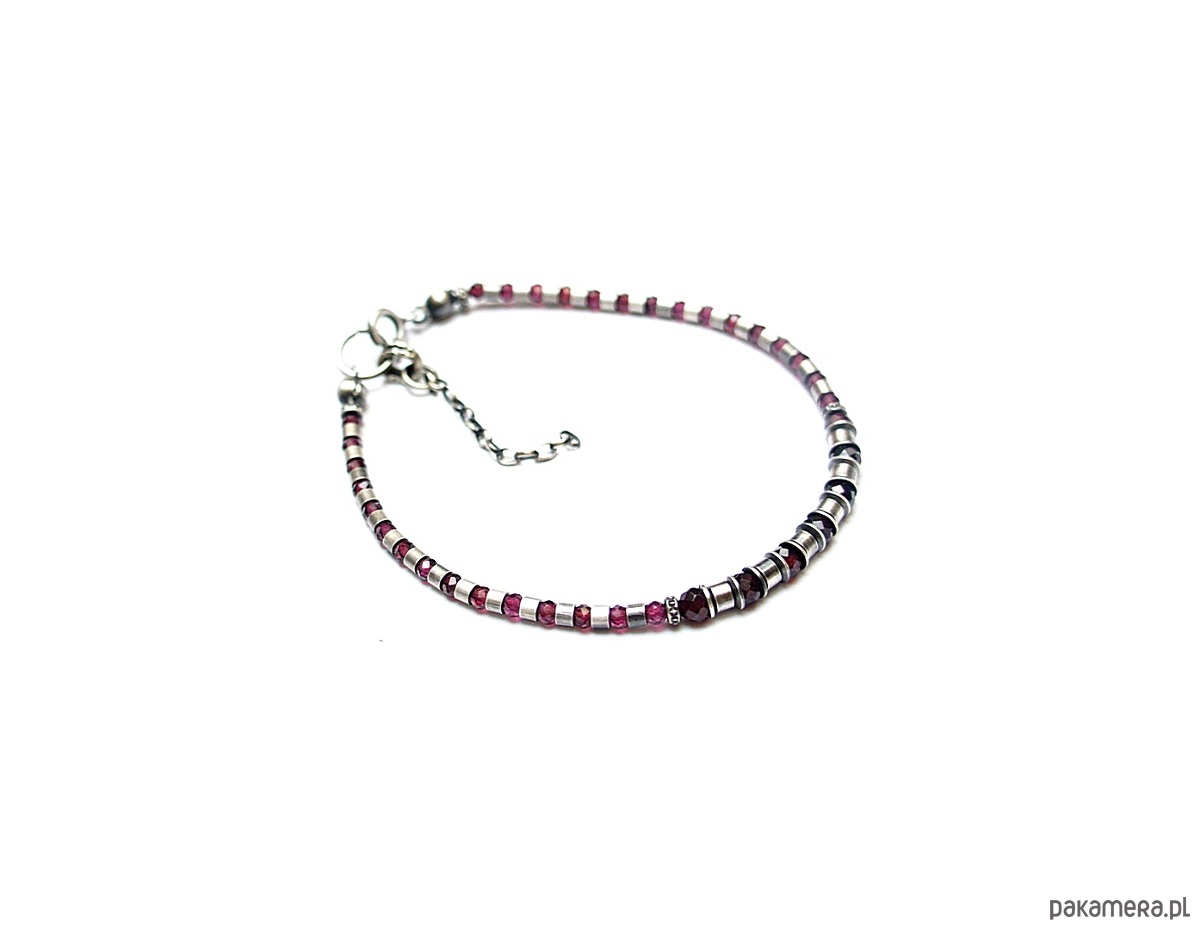 Bransoletka wykonana ze srebra pr. 925 w połączeniu z fasetowanymi kuleczkami granatów [4mm i 2mm] oraz srebrnymi rureczkami . Srebro oksydowane i przetarte. Całkowita długość bransoletki 19,5cm plus dodatkowe ogniwo i ozdobna przedłużka .