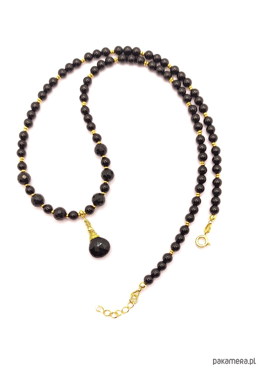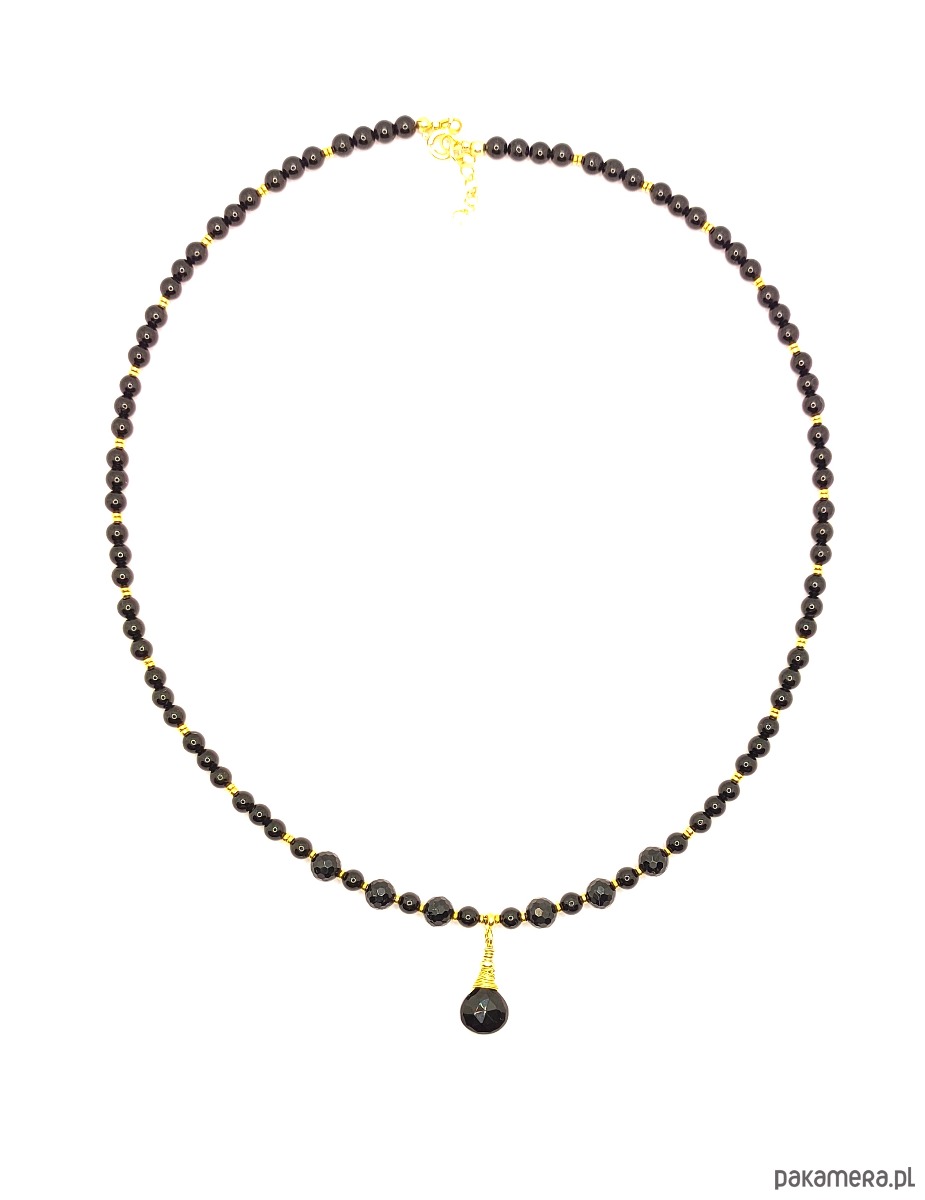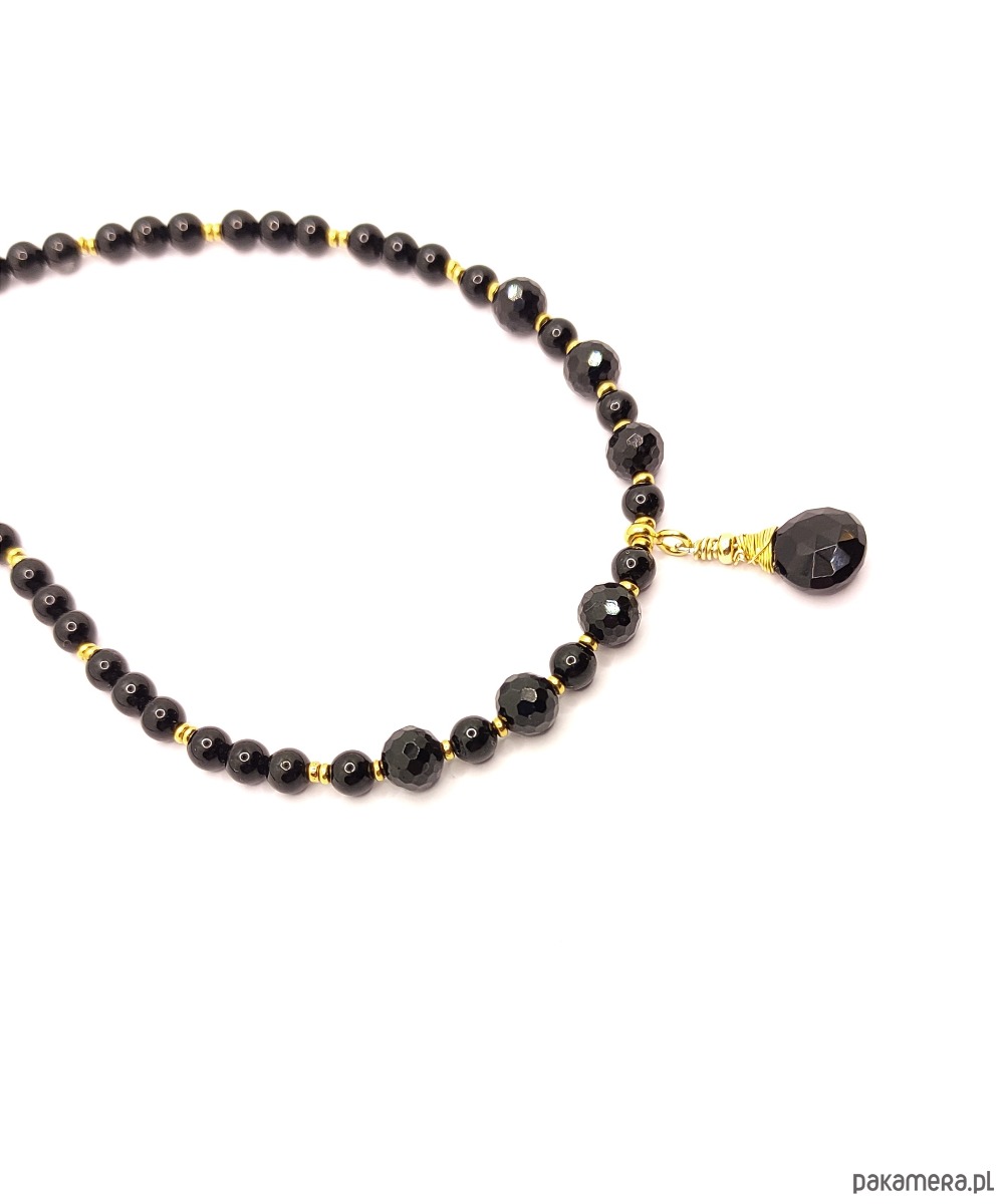 Wyrazisty naszyjnik wykonany z turmalinów. Na sznurze znajdują się gładkie i fasetowane, pełne blasku kule. W centrum mieni się brioletka turmalinu, pięknie szlifowana, opleciona pozłacanym srebrem.