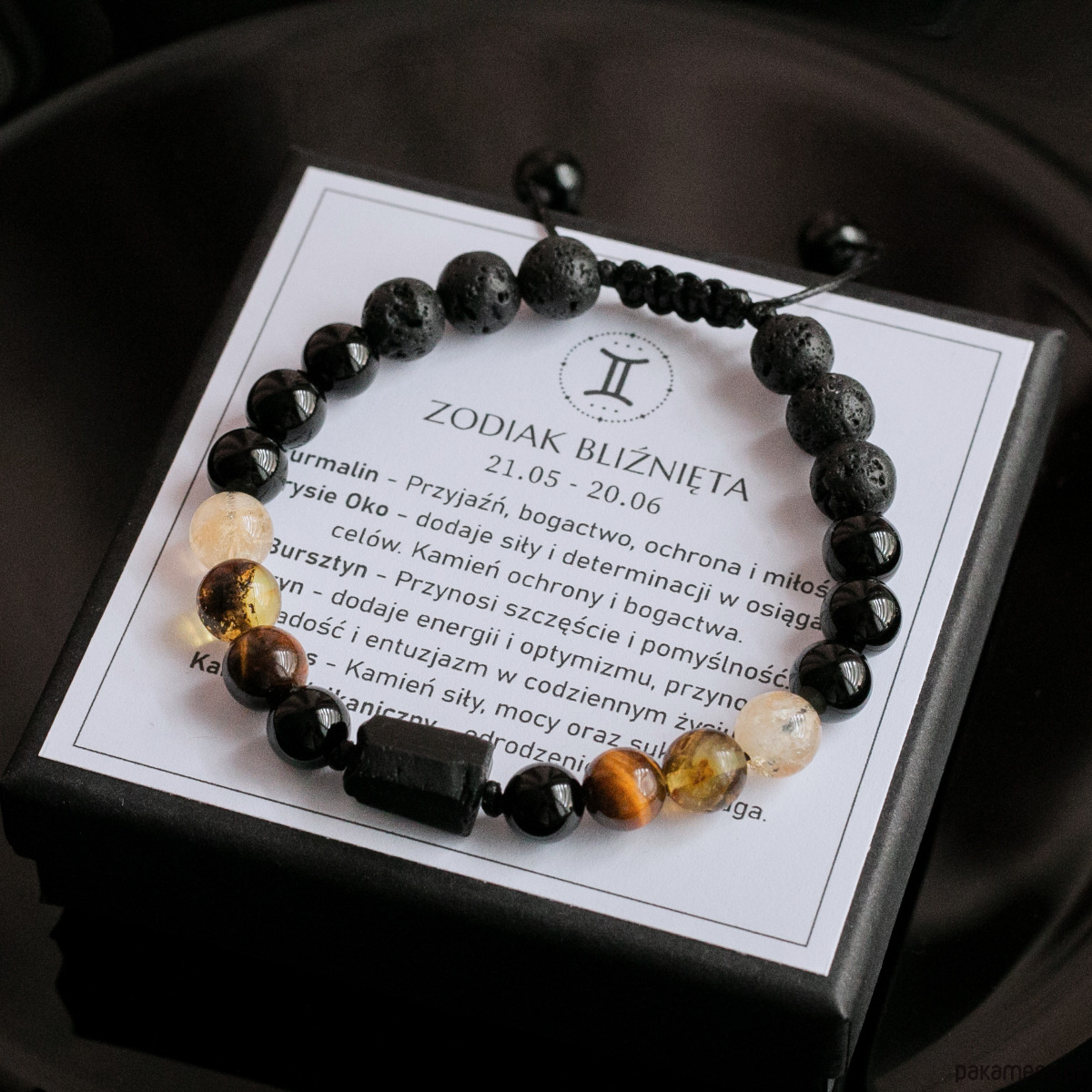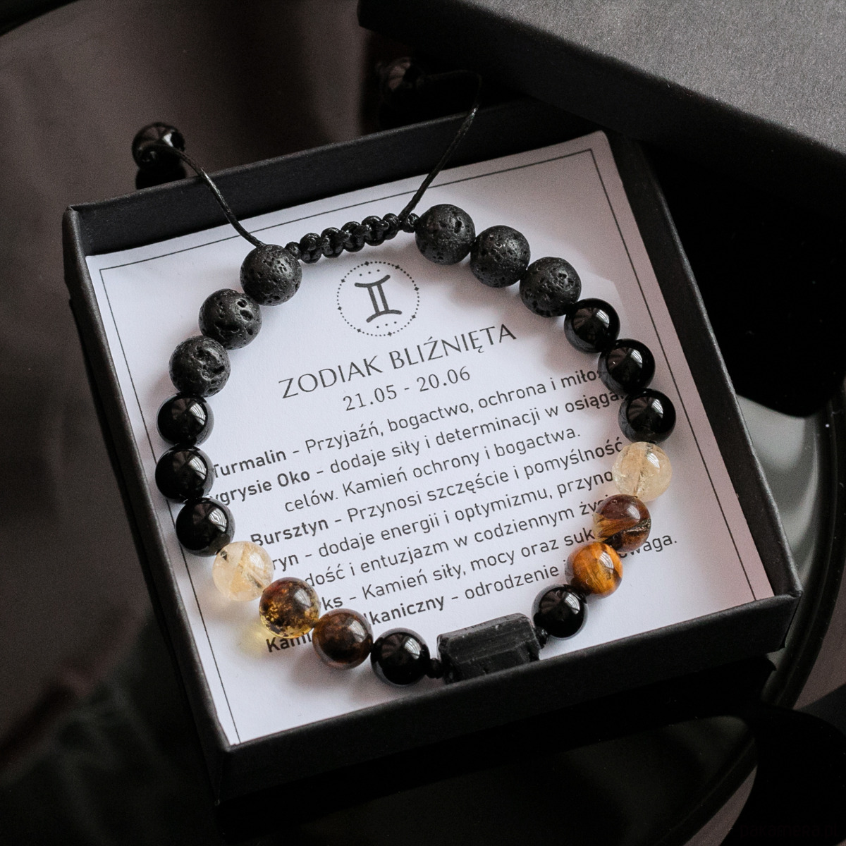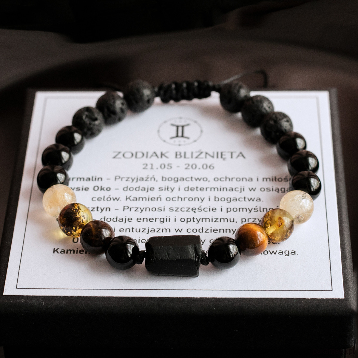 Zodiak Bliźnięta - bransoletka męska została wykonana z kamieni naturalnych dla zodiakalnych Bliźniąt: Turmalin, Tygrysie Oko, Cytryn, Bursztyn, Onyks i Kamień wulkaniczny Lawa.