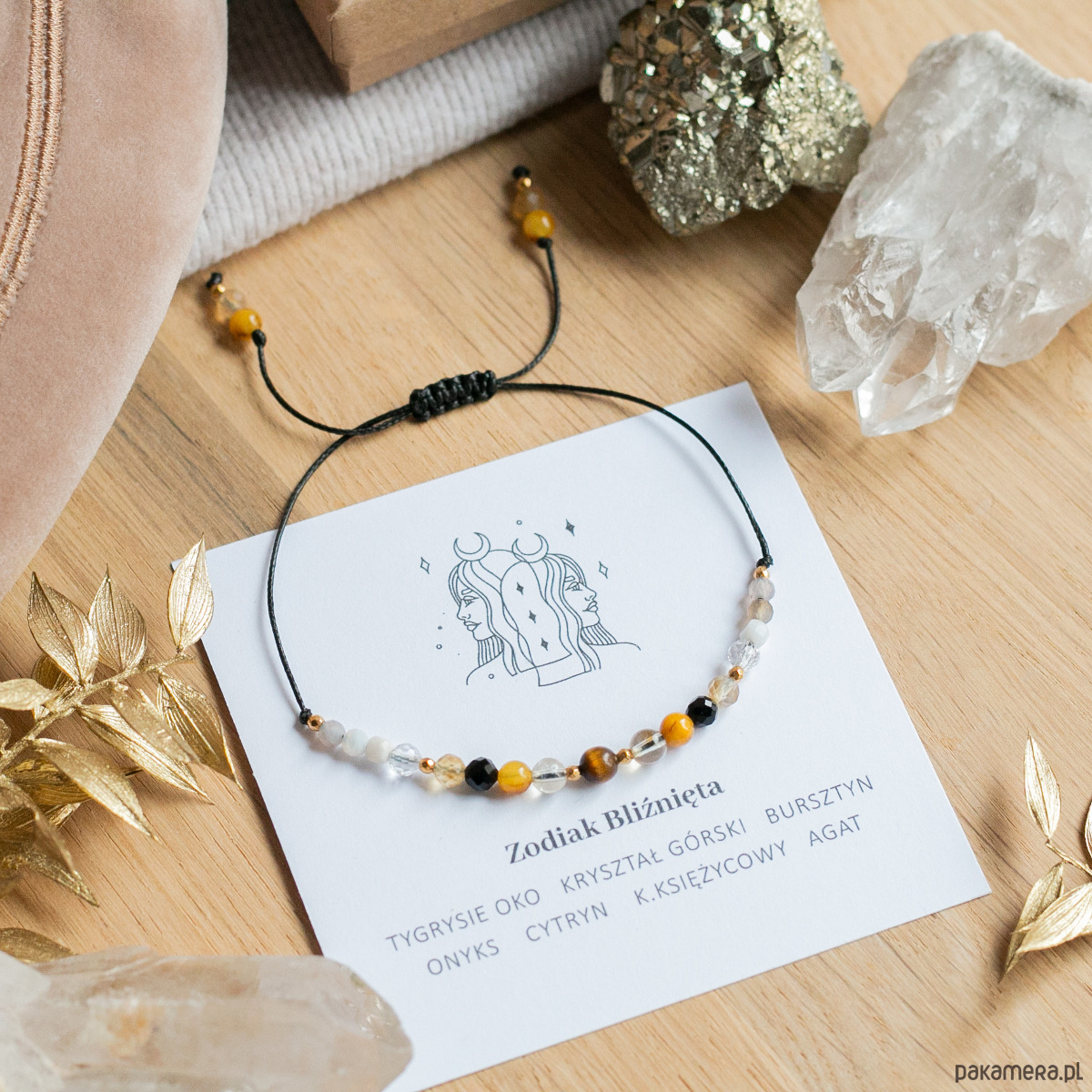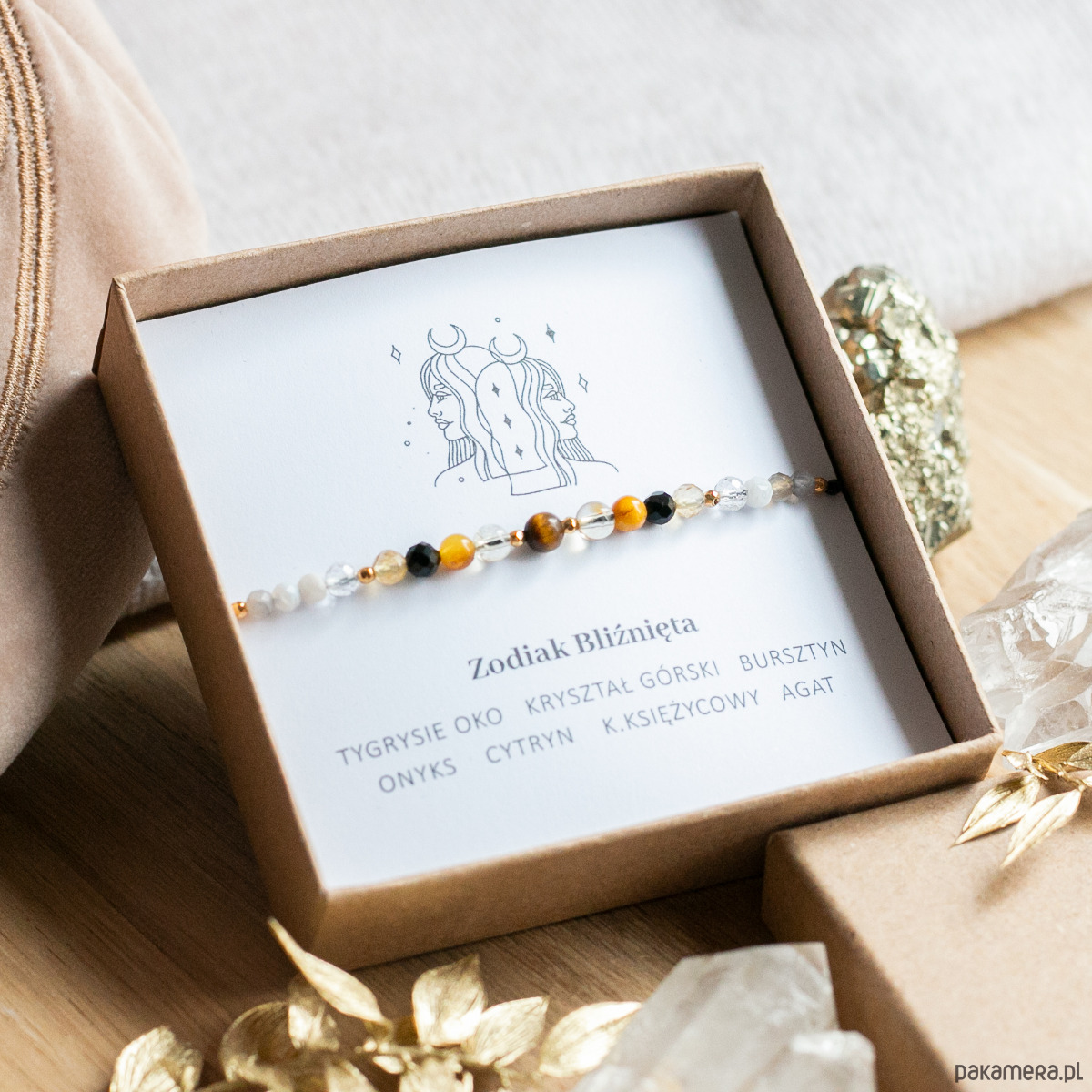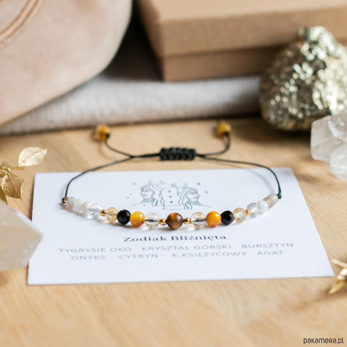Zodiak Bliźnięta - Ta piękna bransoletka damska została wykonana z kamieni naturalnych dla zodiakalnych Bliźniąt: Tygrysie Oko, Kryształ Górski, Bursztyn, Onyks, Cytryn, Kamień Księżycowy i Agat.