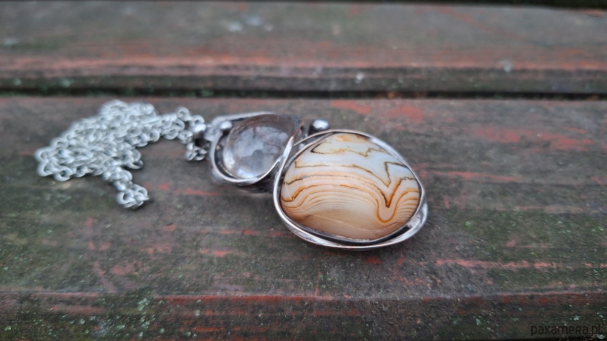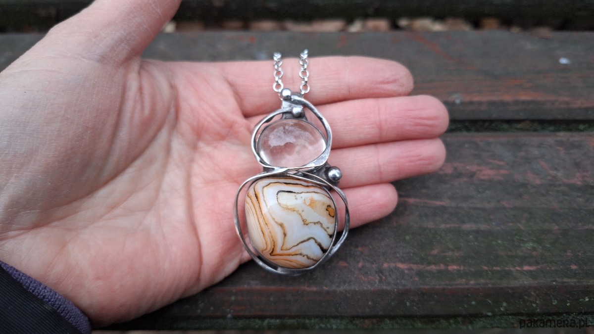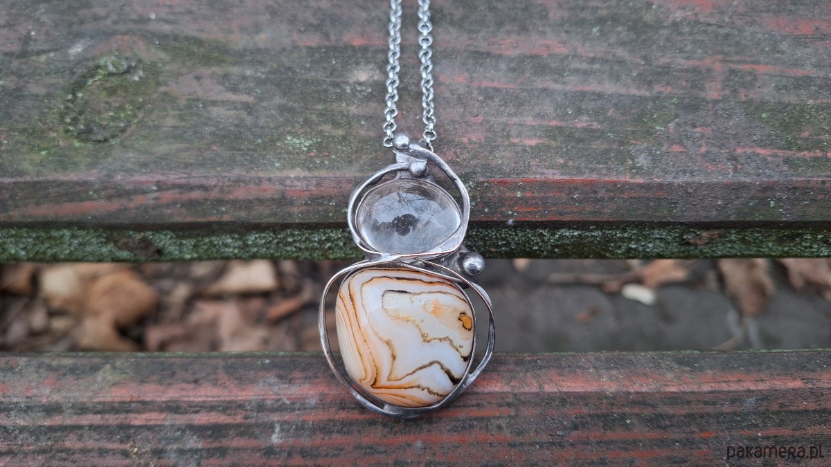 Wisiorek wykonany z miedzi, cyny, kryształu górskiego i naturalnego agatu. Wymiary ok. 5 na 3.5 cm. Zawieszony na łańcuszku o długości ok. 50 cm.