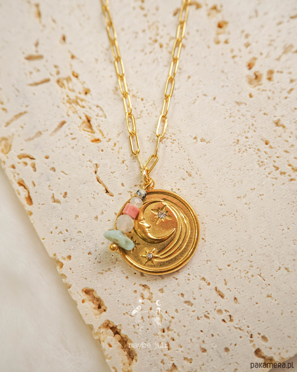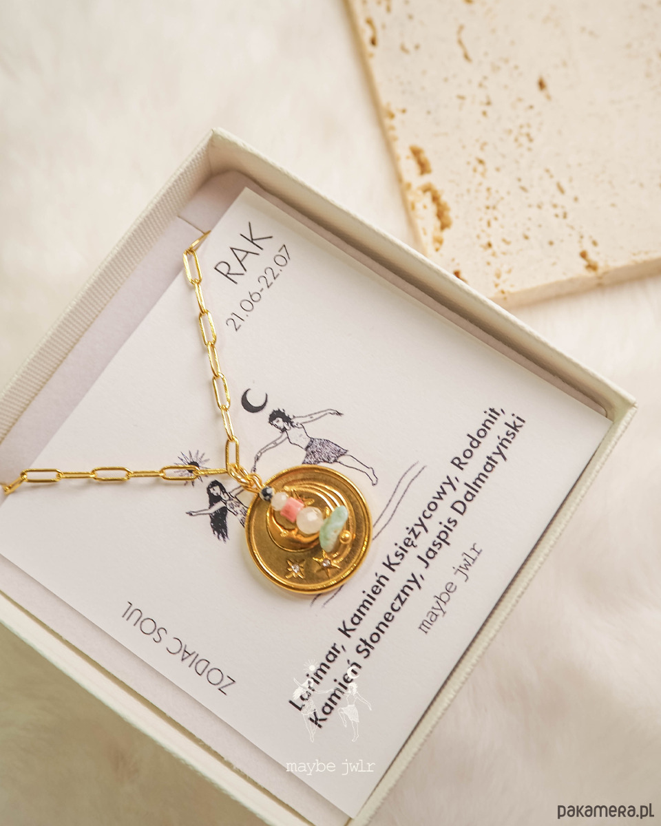 Larimar przynosi spokój, kamień księżycowy wspiera intuicję, rodonit leczy rany emocjonalne, kamień słoneczny dodaje radości, a jaspis dalmatyński przywraca równowagę. Dla duszy pełnej czułości.