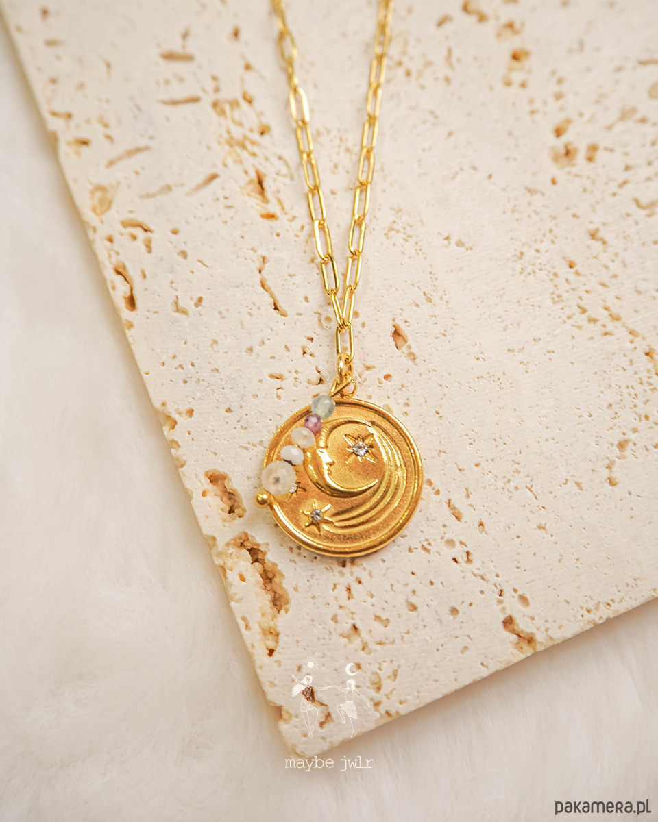 Naszyjnik ma rozmiar uniwersalny dzięki regulacji. Bazą jest modny łańcuszek typu spinacz.