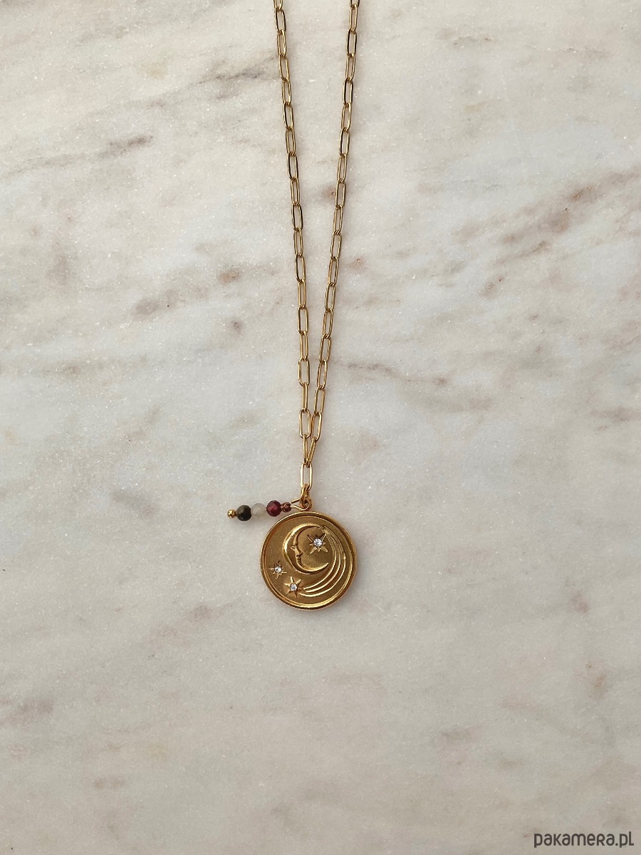 Naszyjnik ma rozmiar uniwersalny dzięki regulacji. Bazą jest modny łańcuszek typu spinacz.