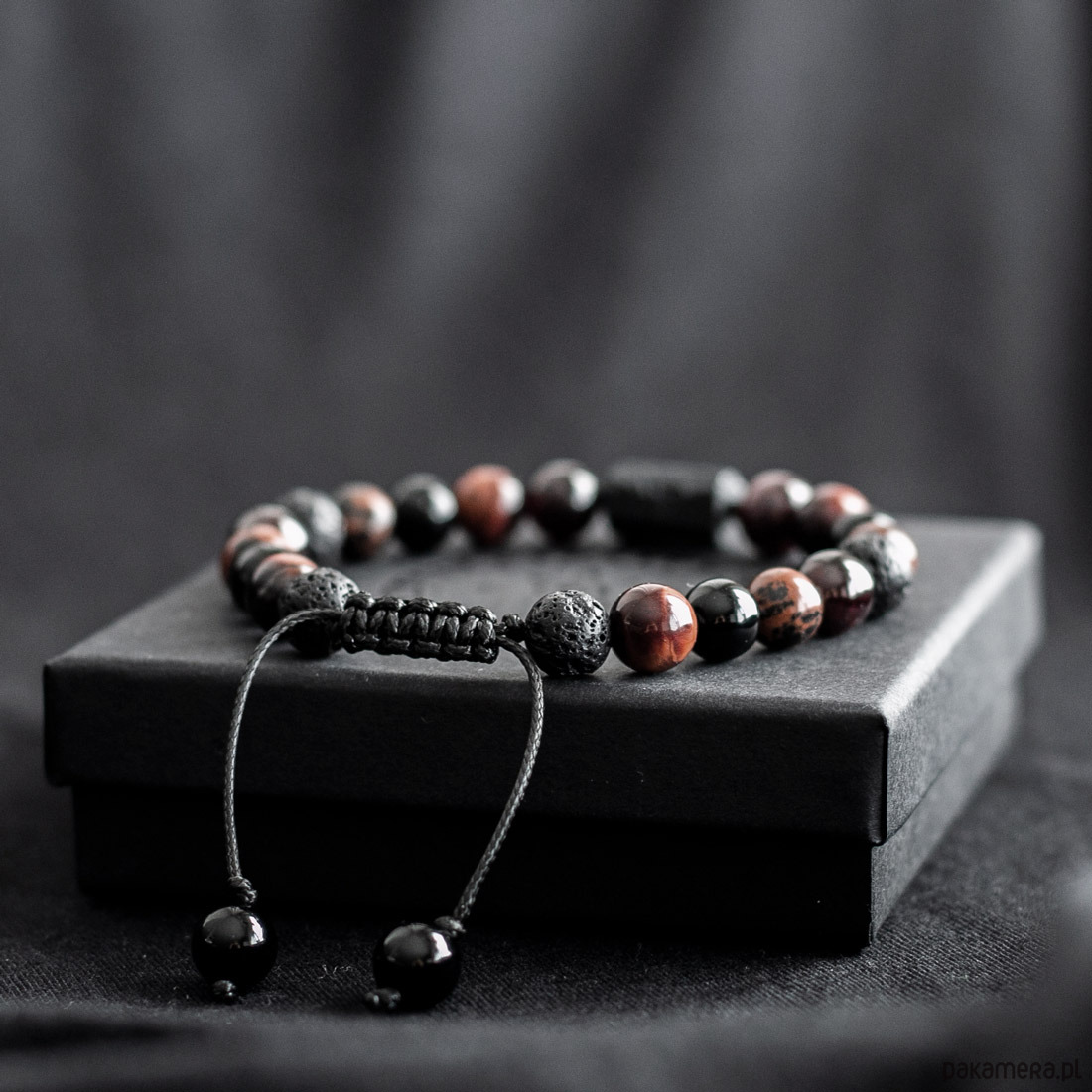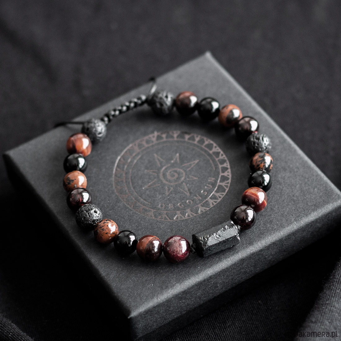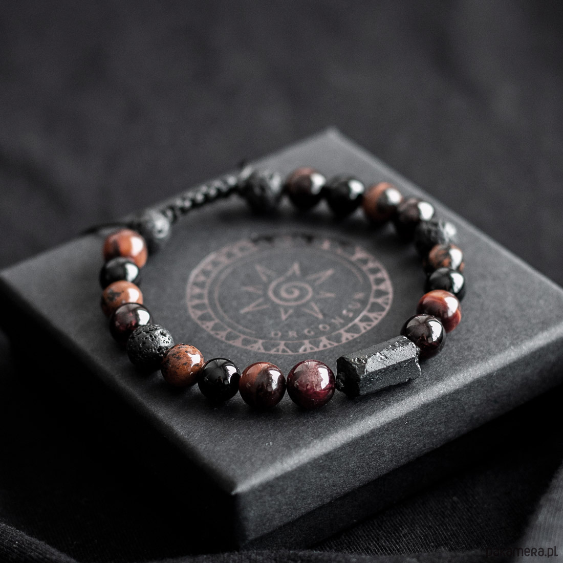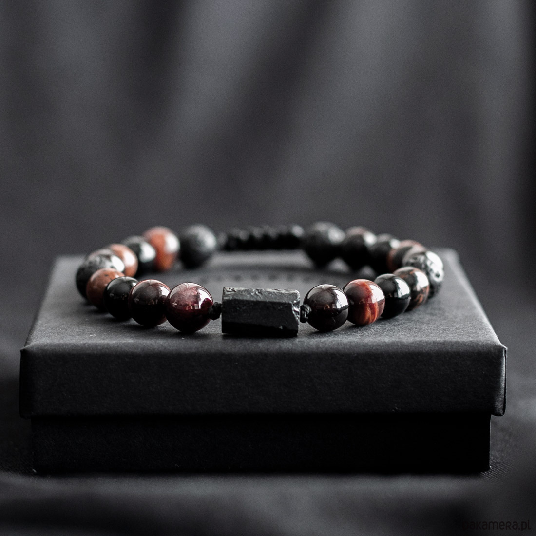 Materiał: Kamienie naturalne: Surowy Turmalin – Bryła, Bawole Oko, Granat, Jaspis, Onyks i Kamień Wulkaniczny o średnicy 8mm. Są to kamienie naturalne dlatego kamienie mogą różnić się nieznacznie wyglądem.