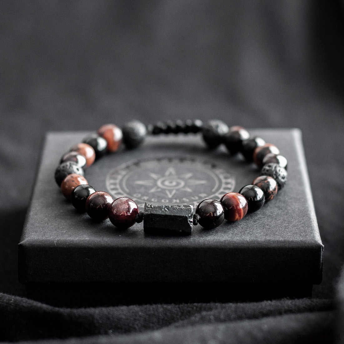 Zodiak Baran - Ta elegancka bransoletka męska została stworzona dla mężczyzn, którzy emanują siłą, pewnością siebie i niezależnością. Wykonana z kamieni naturalnych, takich jak Bawole Oko, Granat, Jaspis, Turmalin, Onyks i Kamień Wulkaniczny.