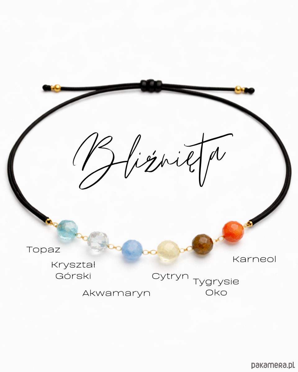 Bransoletka Zodiak Bliźnięta to kompozycja kamieni dobranych tak, aby oddać zmienność i lekkość przypisywaną temu znakowi. W centrum znajduje się sześć naturalnych minerałów ułożonych w ruchomej formie na delikatnym łańcuszku, który pracuje razem z nadgarstkiem.