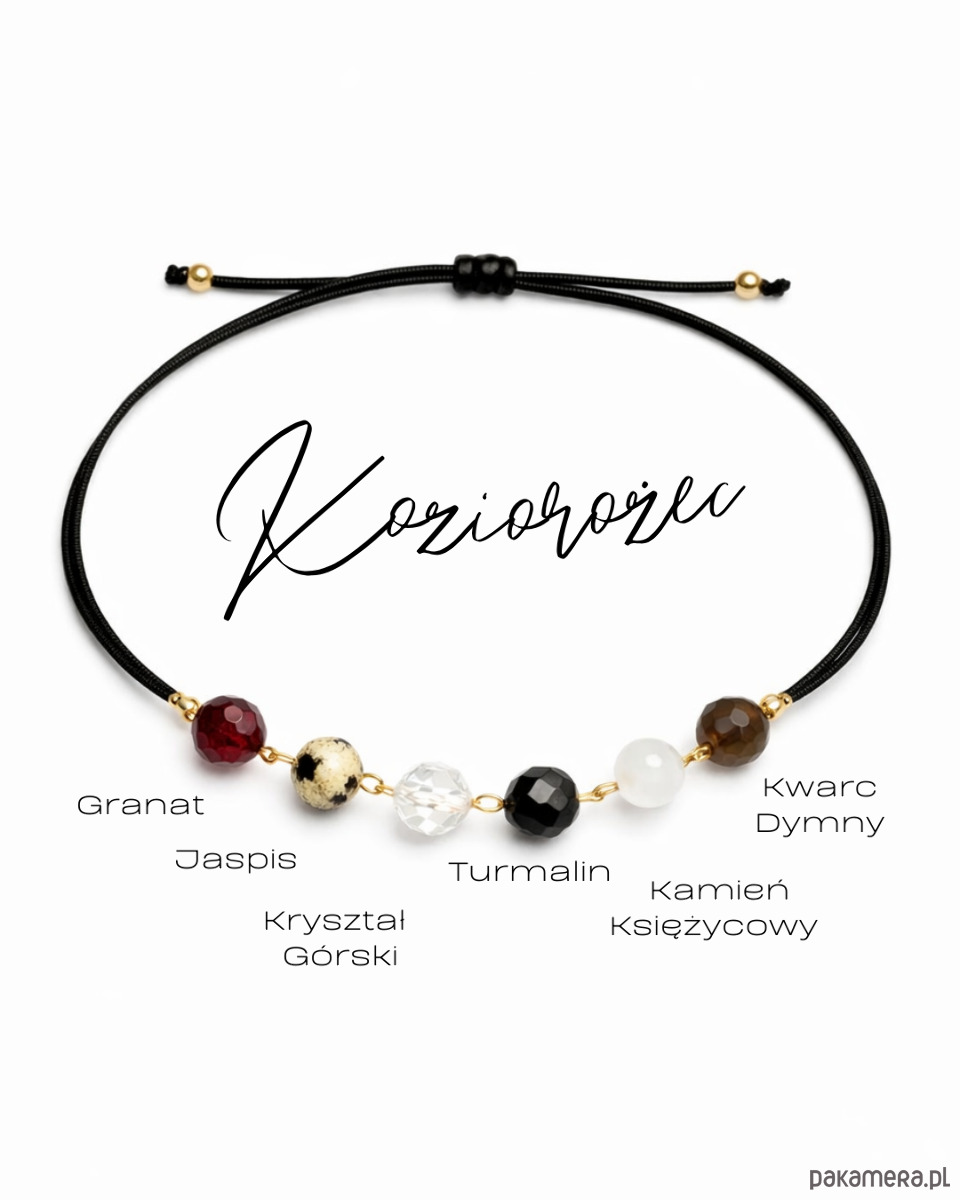Bransoletka Zodiak Koziorożec to kompozycja kamieni dobranych tak, aby nawiązywać do konsekwencji i wewnętrznej siły przypisywanej temu znakowi. W centrum znajduje się sześć naturalnych minerałów ułożonych w lekkiej, ruchomej formie na delikatnym łańcuszku, który pracuje razem z nadgarstkiem.