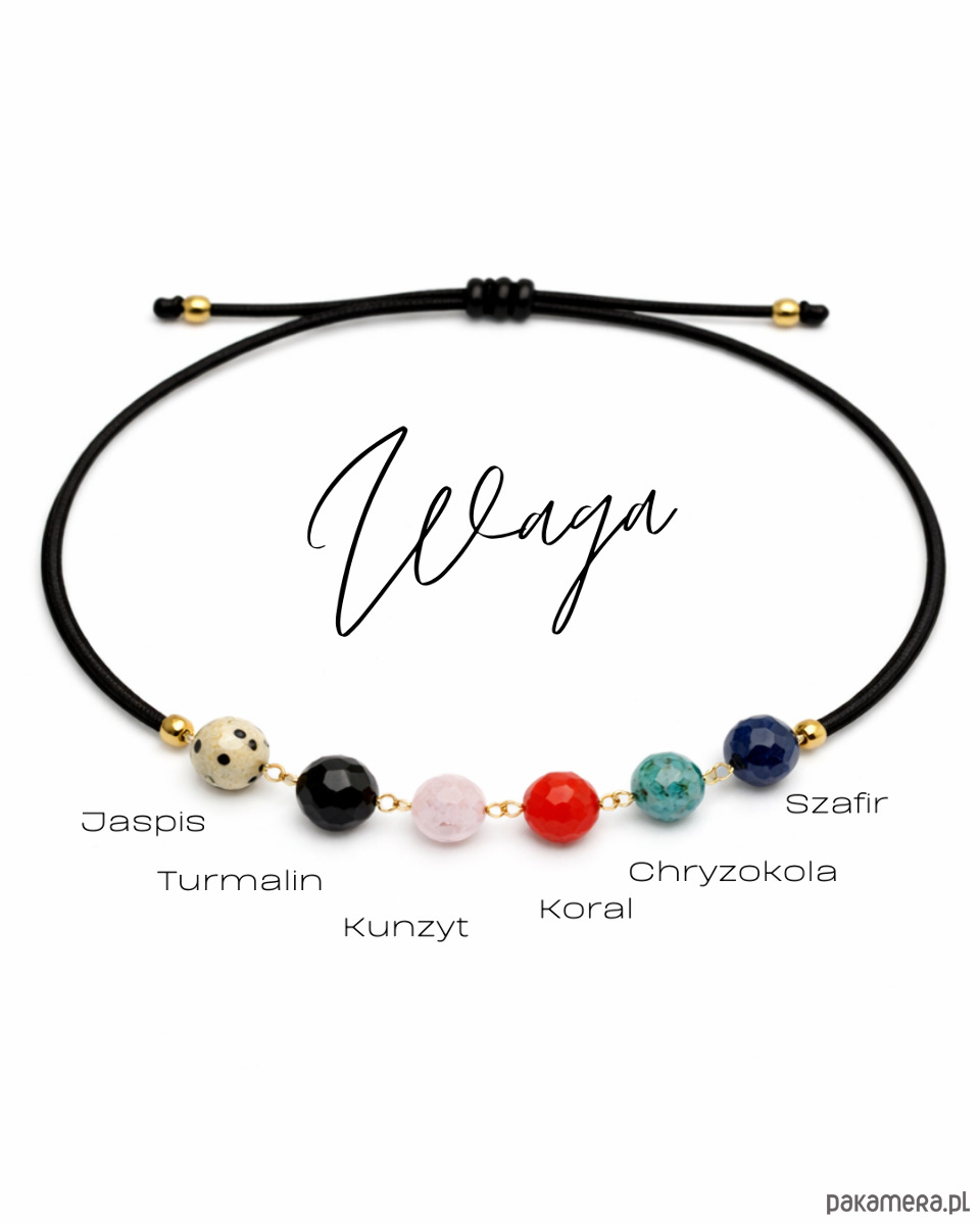 Bransoletka Zodiak Waga to kompozycja kamieni dobranych tak, aby nawiązywać do potrzeby równowagi i harmonii przypisywanej temu znakowi. W centrum znajduje się sześć naturalnych minerałów ułożonych w lekkiej, ruchomej formie na delikatnym łańcuszku, który pracuje razem z nadgarstkiem.