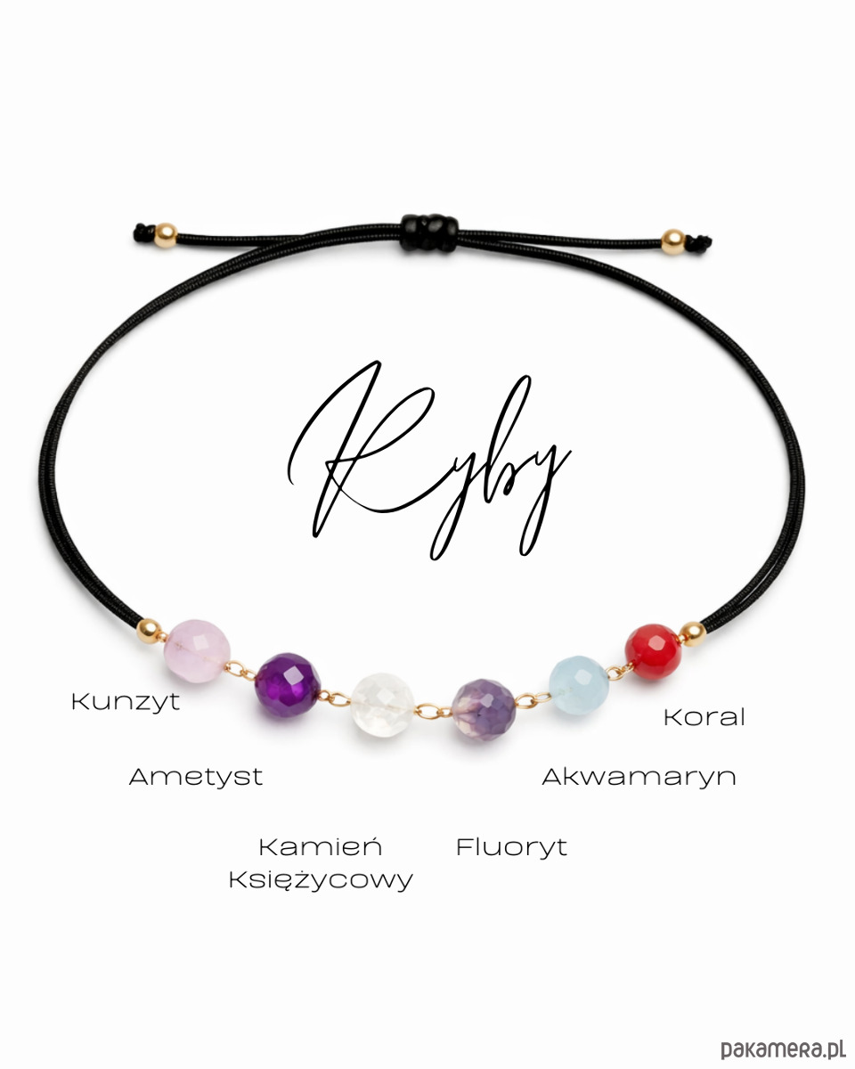 Bransoletka Zodiak Ryby to kompozycja kamieni dobranych tak, aby nawiązywać do wrażliwości i intuicyjnego spojrzenia przypisywanego temu znakowi. W centrum znajduje się sześć naturalnych minerałów ułożonych w lekkiej, ruchomej formie na delikatnym łańcuszku, który pracuje razem z nadgarstkiem.
